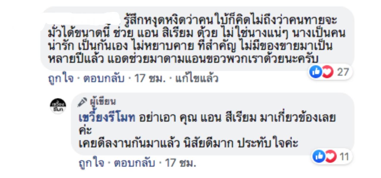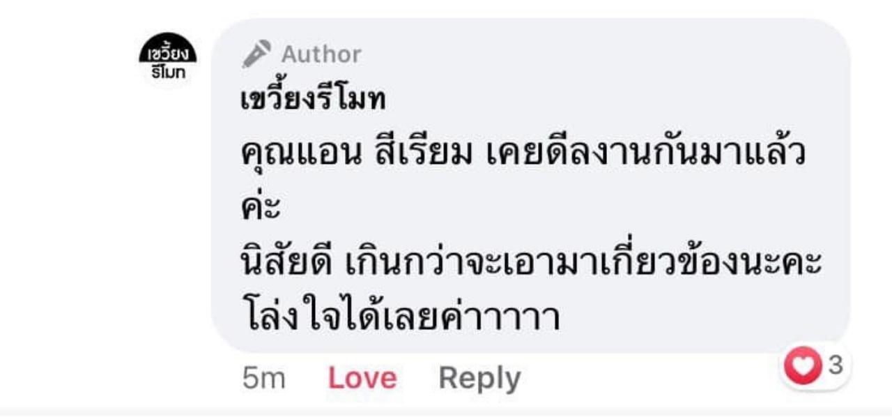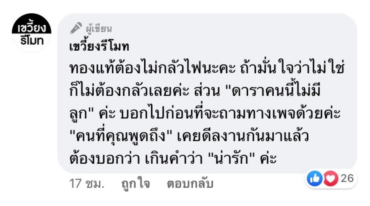 ซึ่งหลังจากที่ทางเพจได้โพสต์ไปก็มีคนเข้ามาเดากันเป็นจำนวนมากว่าใคร โดยมีหลายคนเดาว่า แอน สิเรียม แต่ทางแอดมินเพจก็ได้ออกมาบอกว่า "อย่าเอา คุณแอน สิเรียม มาเกี่ยวข้องเลยค่ะ เคยดีลงานกันมาแล้ว นิสัยดีมาก ประทับใจค่ะ" อีกทั้งหลายคนก็ช่วยยืนยันว่าไม่ใช่แน่นอน นอกจากนี้ ทางแอดมินเพจก็ได้เขียนว่า "คนนี้ไม่มีลูกนะคะ" และ "ทองแท้ต้องไม่กลัวไฟนะคะ ถ้ามั่นใจว่าไม่ใช่ ก็ไม่ต้องกลัวเลยค่ะ ส่วน "ดาราคนนี้ไม่มีลูก" ค่ะ บอกไปก่อนที่จะถามทางเพจด้วยค่ะ "คนที่คุณพูดถึง" เคยดีลงานกันมาแล้ว ต้องบอกว่า เกินคำว่า "น่ารัก" ค่ะ"