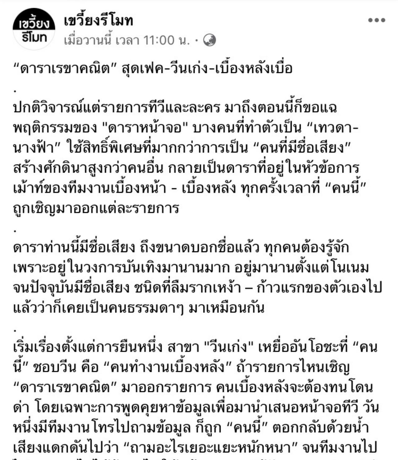 มีเรื่องเม้าท์แซ่บๆ ในวงการบันเทิงมาให้ได้ทายกันอีกแล้วจ้า เมื่อเพจ เขวี้ยงรีโมท ได้ออกมาเผยถึงพฤติกรรมสุดปลอมของดาราคนหนึ่ง โดยใช้คำเรียกแทนว่า "ดาราเรขาคณิต" ที่เบื้องหน้ากับเบื้องหลังเหมือนเป็นคนละคนเลยทีเดียว ทำเอาทีมงานที่ทำงานด้วย รู้สึกเอือมระอาไปตามๆ กัน โดยใน เพจเขวี้ยงรีโมท ได้เขียนไว้ว่า