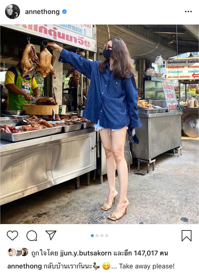 งานนี้เลยได้เห็นนางเอกตัวแม่ แอน ทองประสม ที่ออกจากบ้านมาซื้อเป็ดที่ร้าน ซึ่งงานนี้สาวแอนจัดเต็มแฟชั่นป้องกันตัวเองจาก COVID-19 ด้วยการสวม Mask ปิดไปครึ่งหน้า สวมแว่นตากันแดดและหมวก ใส่เสื้อแขนยาวมิดชิด แต่งานนี้คนไม่ได้โฟกัสที่เป็ดแต่อย่างใด