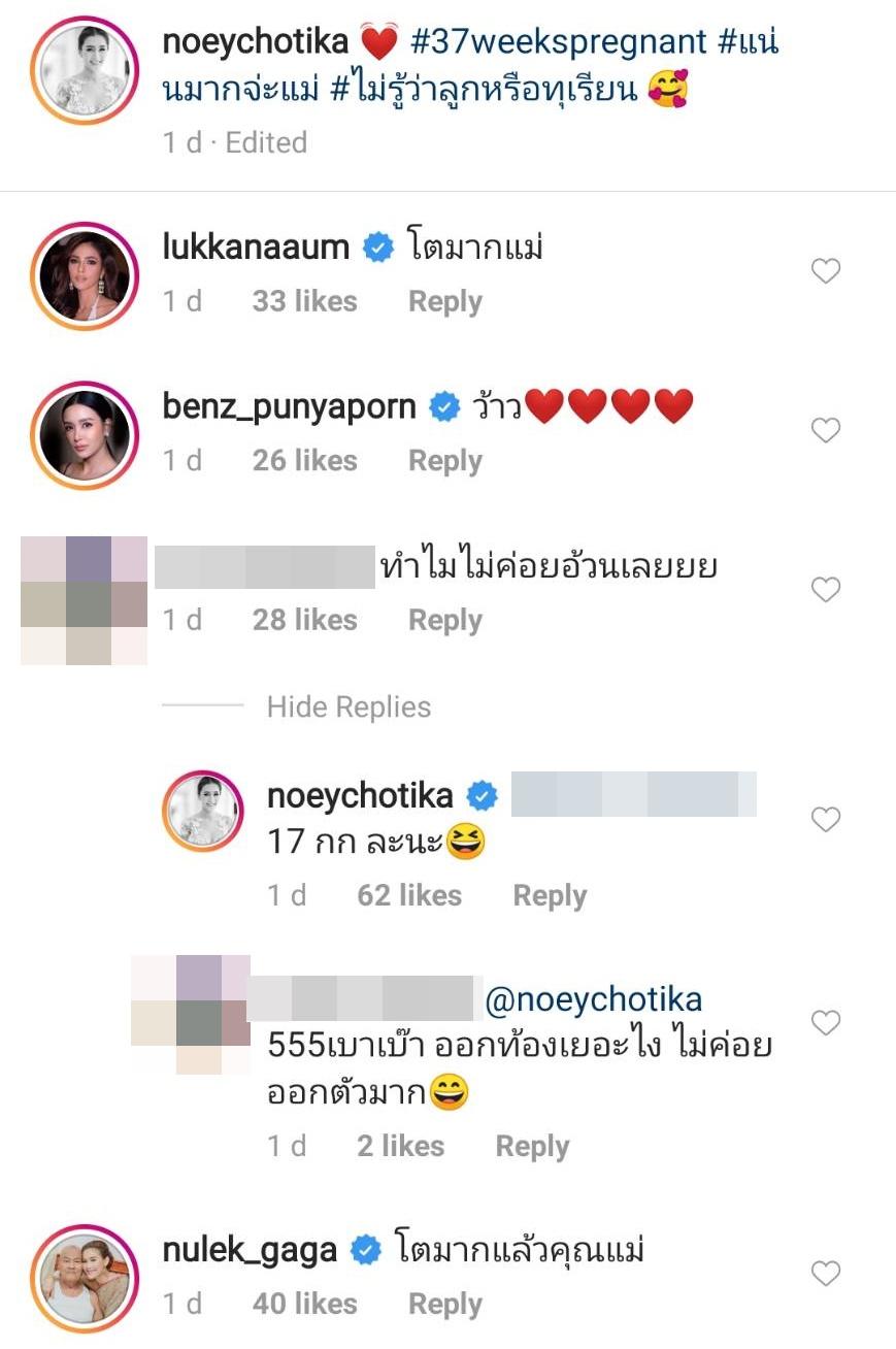 นอกจากนี้ยังมีเพื่อนเข้ามาคอมเมนต์ชมว่าทำไมไม่ค่อยอ้วนเลย ซึ่ง เนย โชติกา บอกว่า “17 กก. ละนะ” และเพื่อนคนดังกล่าวตอบกลับว่า “555 เบาเบ๊า ออกท้องเยอะไง ไม่ค่อยออกตัวมาก”.
