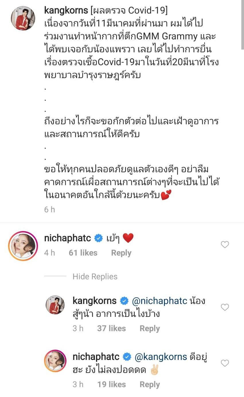 ซึ่งหลังจากนั้นก็มีแฟนๆ เข้ามาแสดงความยินดี พร้อมทั้งบอกว่าให้กักตัวต่อไป รวมไปถึง แพรวา ณิชาภัทร ที่เข้ามาคอมเมนต์ว่า “เย้ๆ” และใส่อีโมจิรูปหัวใจ ส่วน กั้ง เดอะสตาร์ ให้กำลังใจและถามกลับว่า “น้องสู้ๆ น้า อาการเป็นไงบ้าง” ก่อนที่ แพรวา ณิชาภัทร จะตอบว่า “ดีอยู่ฮะ ยังไม่ลงปอดดด” ด้วย.