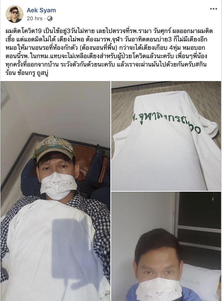โดย เอก ไซแอม โพสต์ภาพตัวเองนอนอยู่ที่ รพ.จุฬาลงกรณ์ และเขียนข้อความว่า “ผมติดโควิด-19 เป็นไข้อยู่ 3 วันไม่หาย เลยไปตรวจที่ รพ.รามา วันศุกร์ ผลออกมาผมติดเชื้อ แต่แอดมิทไม่ได้ เตียงไม่พอ ต้องมา รพ.จุฬาฯ วันอาทิตย์ตอนบ่าย 3 ก็ไม่มีเตียงอีก