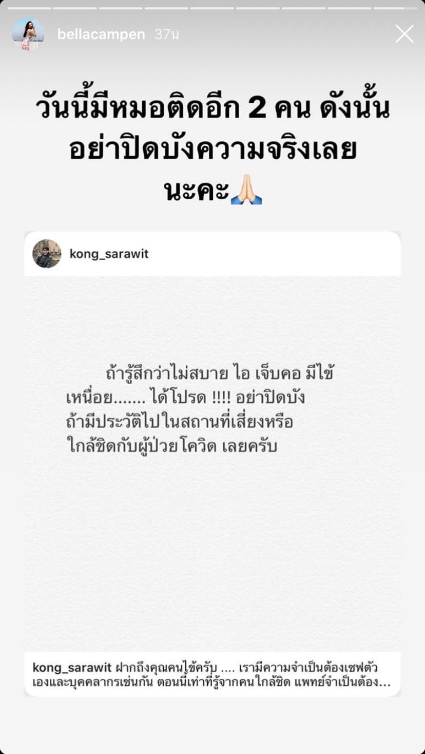 โดยสาวเบลล่าได้นำข้อมูลที่ หมอก้อง สรวิชญ์ ที่โพสต์ว่า "ถ้ารู้สึกไม่สบาย ไอ เจ็บคอ มีไข้ เหนื่อย ได้โปรด อย่าปิดบังถ้ามีประวัติไปสถานที่เสี่ยงหรือใกล้ชิดกับผู้ป่วยโควิดเลยครับ" พร้อมแคปชั่นว่า "ฝากถึงคุณคนไข้ครับ เรามีความจำเป็นต้องเซฟตัวเอง และบุคลากรเช่นกัน ตอนนี้เท่าที่รู้จากคนใกล้ชิด แพทย์จำเป็นตัองกักตัวเองเป็นสิบรายแล้วครับ"