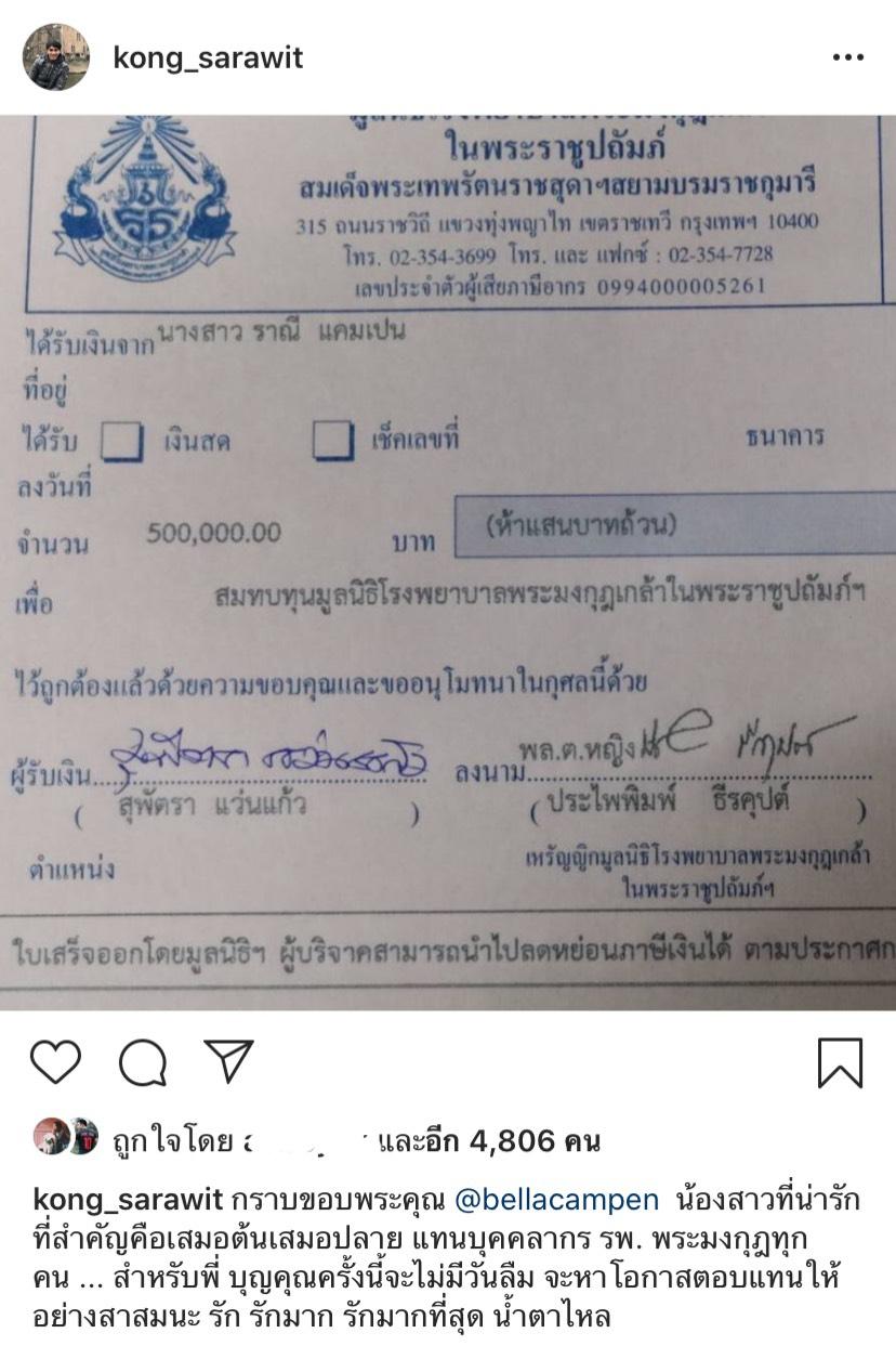 และนอกจากจะช่วยกระจายข่าวเรื่องนี้แล้ว สาวเบลล่ายังได้บริจาคเงินเป็นจำนวน 5 แสนบาท ให้กับมูลนิธิโรงพยาบาลพระมงกุฎเกล้า ในพระราชูปถัมภ์อีกด้วย