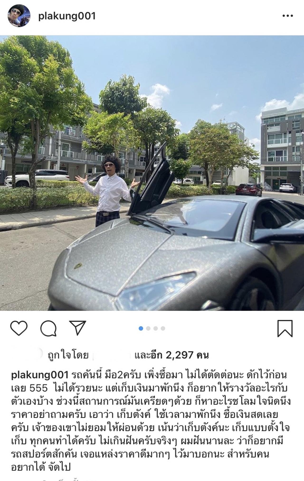 ซึ่ง ดีเจพล่ากุ้ง ก็ได้เขียนแคปชั่นไว้ว่า "รถคันนี้ มือ2ครับ เพิ่งซื้อมา ไม่ได้ตัดต่อนะ ดักไว้ก่อนเลย 555 ไม่ได้รวยนะ แต่เก็บเงินมาพักนึง ก็อยากให้รางวัลอะไรกับตัวเองบ้าง ช่วงนี้สถานการณ์มันเครียดๆ ด้วย ก็หาอะไรชโลมใจนิดนึง ราคาอย่าถามครับ