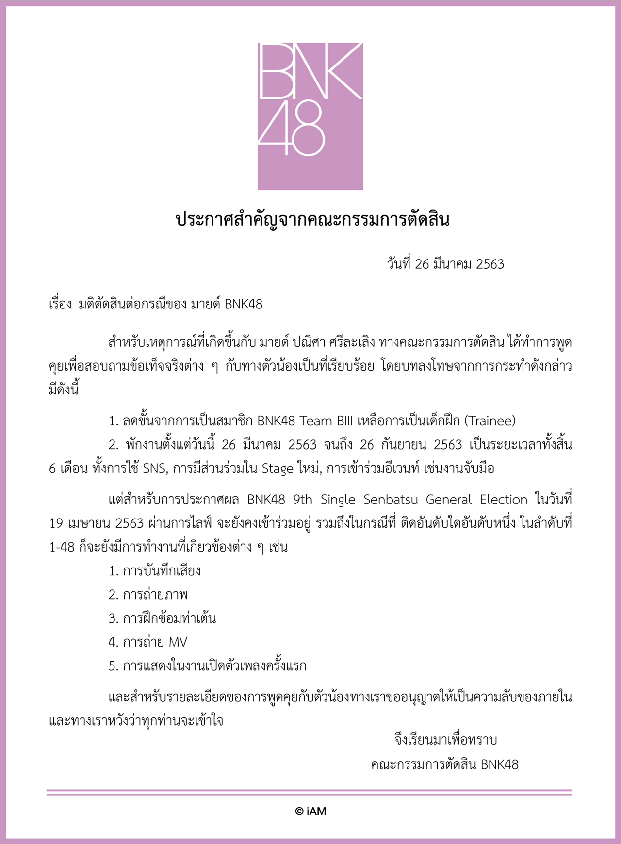 ซึ่งเรื่องนี้ทางต้นสังกัด BNK48 ได้มีประกาศลงดาบสั่งพักงานเป็นเวลา 6 เดือน และลดขั้นเหลือแค่ เด็กฝึก
