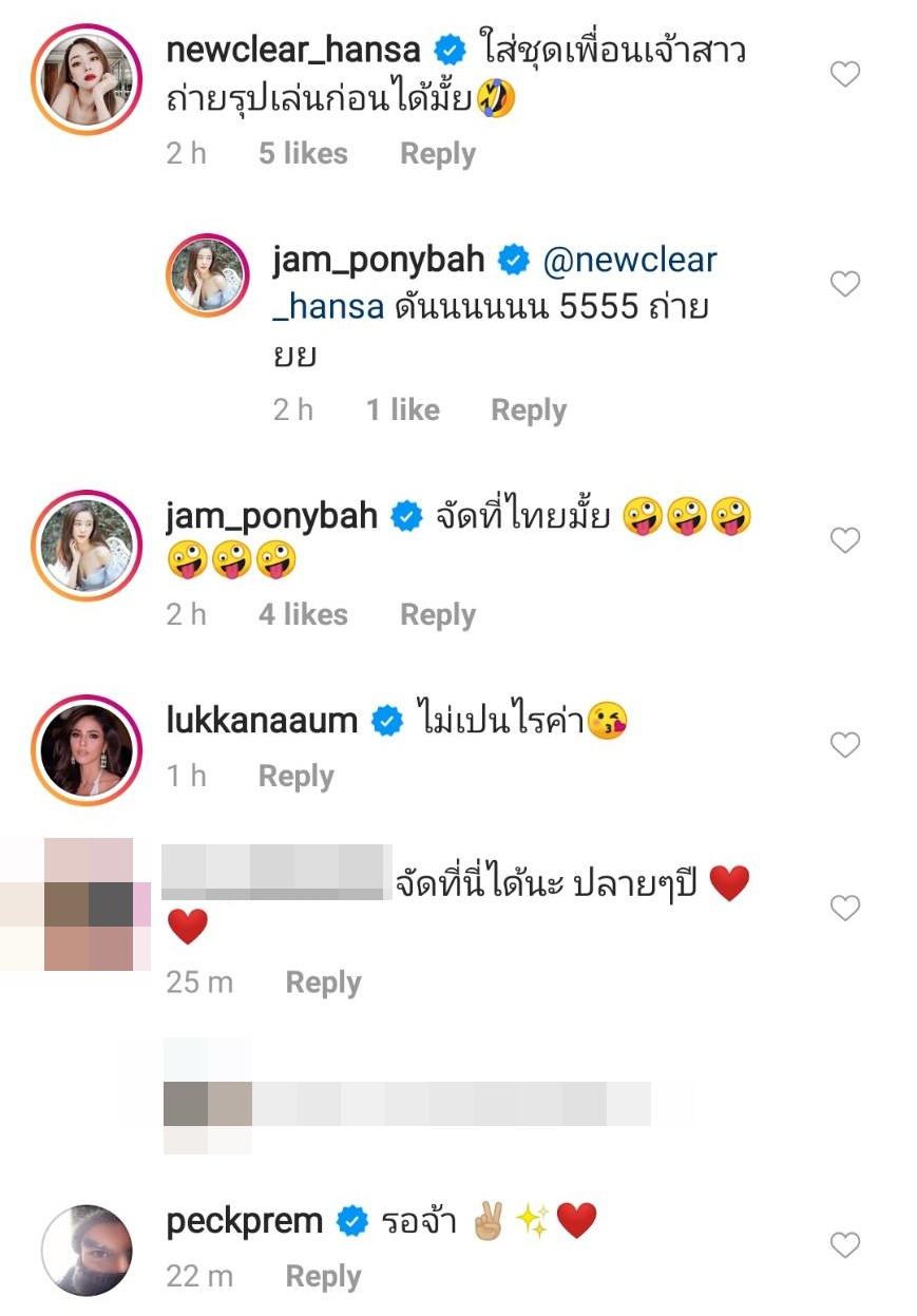หลังจากนั้นก็มีเพื่อนในวงการบันเทิง อาทิ อุ้ม ลักขณา เข้ามาบอกว่า “ไม่เป็นไรค่ะ” ส่วน นิวเคลียร์ หรรษา บอกว่า “ใส่ชุดเพื่อนเจ้าสาวถ่ายรูปเล่นก่อนได้มั้ย” และ เนย วรัฐฐา ตอบว่า “ดันนนนนน 5555 ถ่ายยย” ด้านแฝดพี่ แจม ชรัฐฐา บอกว่า “จัดที่ไทยมั้ย” ฯลฯ