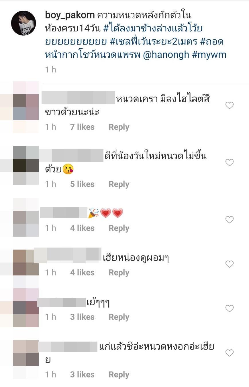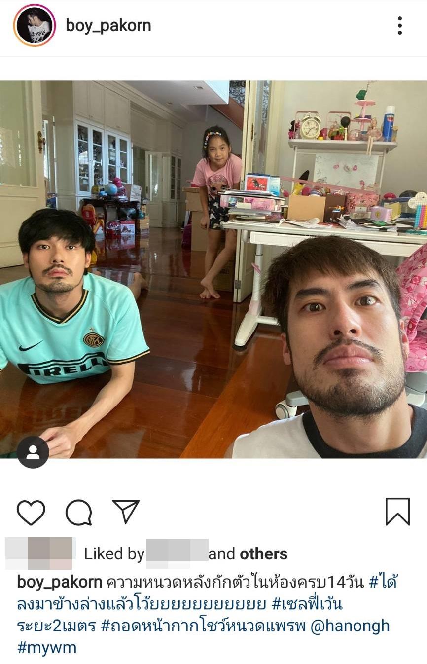 โดย บอย ปกรณ์ โพสต์ภาพเซลฟี่กับ หน่อง ธนา และ น้องวันใหม่ พร้อมทั้งเขียนข้อความ “ความหนวดหลังกักตัวในห้องครบ 14 วัน #ได้ลงมาข้างล่างแล้วโว้ยยยยยยยยยยย #เซลฟี่เว้นระยะ2เมตร #ถอดหน้ากากโชว์หนวดแพรพ @hanongh #mywm”
