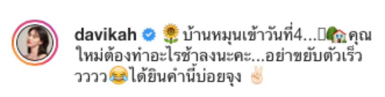 ซึ่ง ใหม่ ดาวิกา ได้เผยในอินสตาแกรมว่า “บ้านหมุนเข้าวันที่4... คุณใหม่ต้องทำอะไรช้าลงนะคะ... อย่าขยับตัวเร็ววววว ได้ยินคำนี้บ่อยจุง”