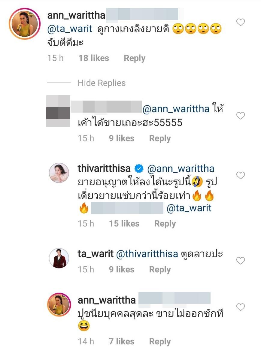 งานนี้ทำเอา แอน วริษฐา ภรรยาของ ต๊ะ วริษฐ์ ถึงกับแซว เมย์ ว่า “ดูกางเกงลิงยายดิ จับตีดีมะ” ก่อนที่ ฐิสา ตอบกลับว่า “ยายอนุญาตให้ลงได้นะรูปนี้ รูปเดี่ยวยายแซ่บกว่านี้ร้อยเท่า” ด้าน ต๊ะ วริษฐ์ คอมเมนต์แซวว่า “ตูดลายปะ”