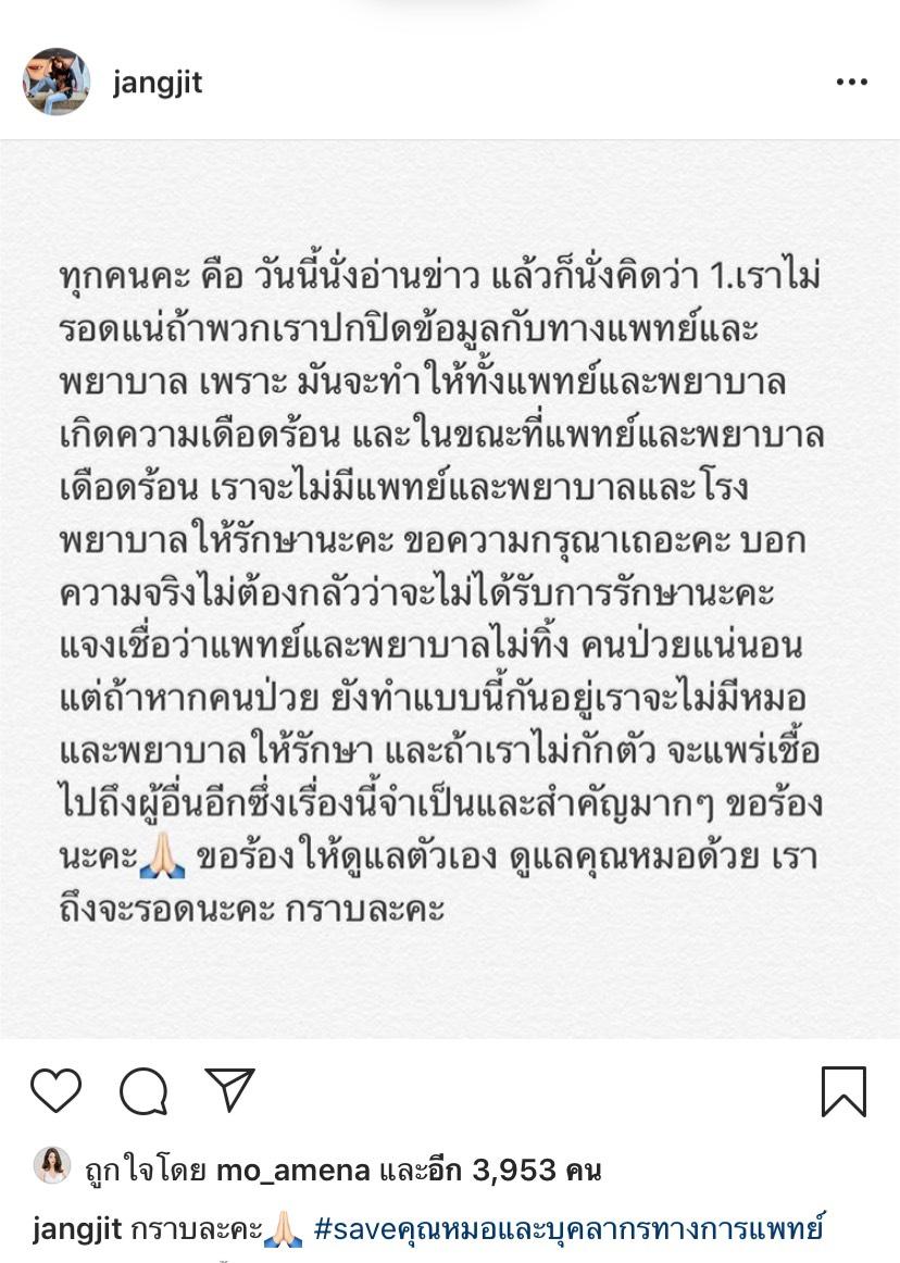 ซึ่งเรื่องนี้จำเป็นและสำคัญมากๆ และขอร้องนะคะ ขอร้องให้ดูแลตัวเอง ดูแลคุณหมอด้วย เราถึงจะรอด กราบล่ะค่ะ" พร้อมแคปชั่นว่า กราบล่ะค่ะ #saveคุณหมอและบุคลากรทางการแพทย์".