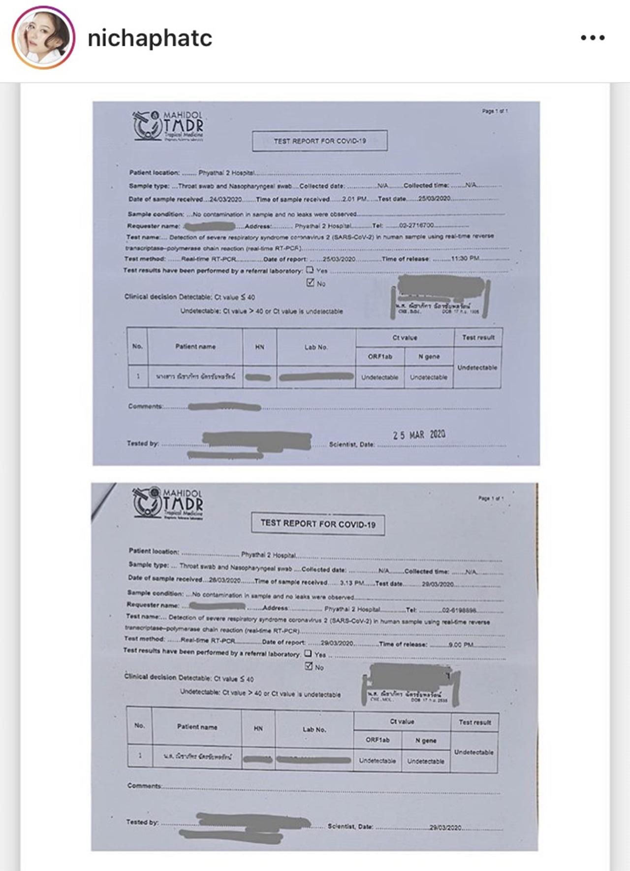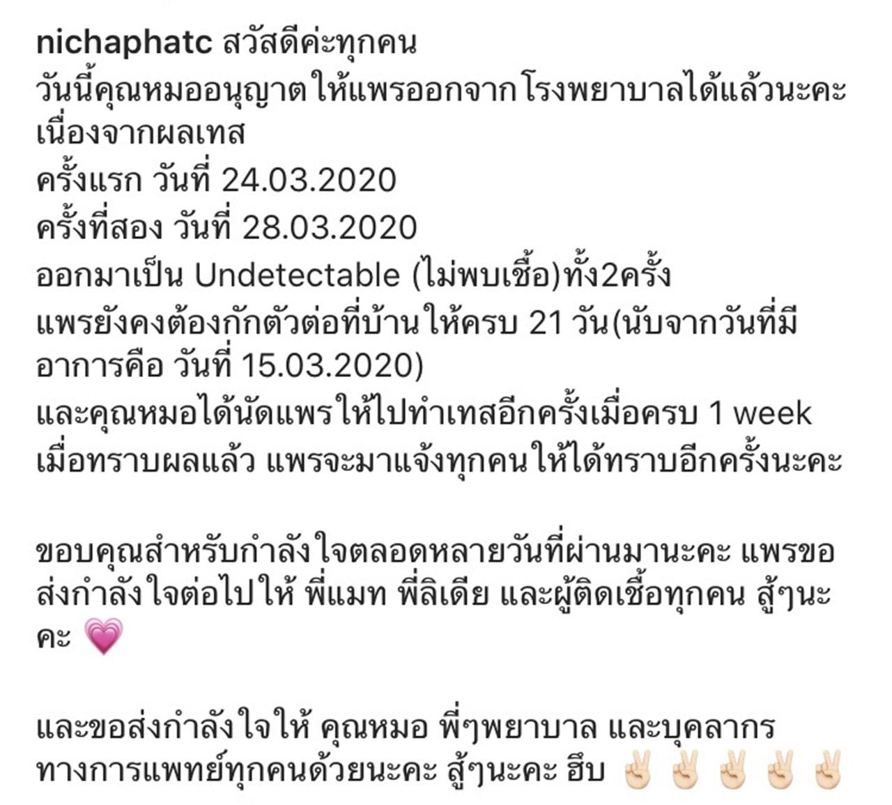 "สวัสดีค่ะทุกคน วันนี้คุณหมออนุญาตให้แพรออกจากโรงพยาบาลได้แล้วนะคะ เนื่องจากผลเทสครั้งแรก วันที่ 24.03.2020 ครั้งที่สอง วันที่ 28.03.2020 ออกมาเป็น Undetectable (ไม่พบเชื้อ) ทั้ง 2 ครั้ง