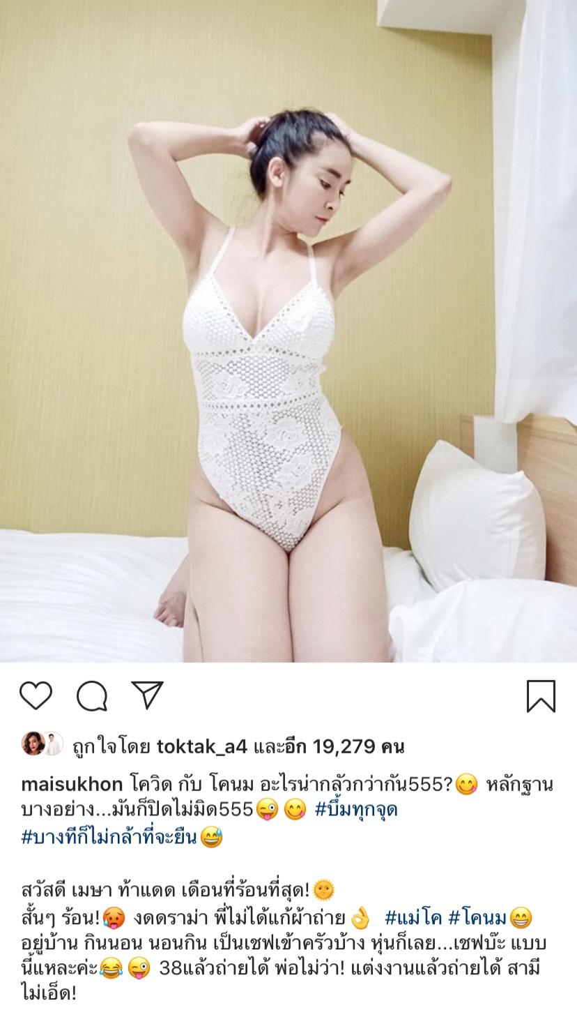 ซึ่งสาวใหม่ ได้ใส่ชุดว่ายน้ำสีขาวลายลูกไม้ทั้งตัว โพสท่าถ่ายรูปสุดเซ็กซี่บนเตียงนอน พร้อมแคปชั่นสุดเด็ดว่า "โควิด กับ โคนม อะไรน่ากลัวกว่ากัน555? หลักฐานบางอย่าง...มันก็ปิดไม่มิด555 #บึ้มทุกจุด #บางทีก็ไม่กล้าที่จะยืน