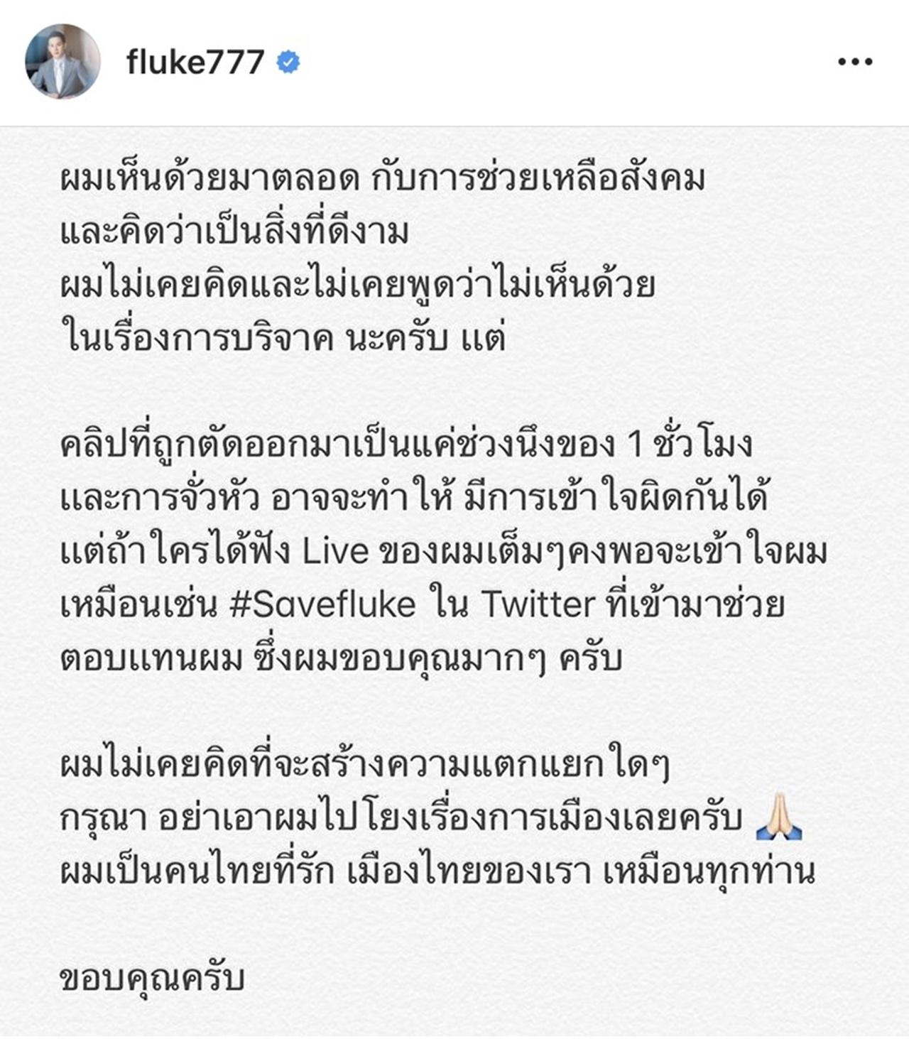 จากนั้น ฟลุค ก็ได้โพสต์เพื่อชี้แจงอีกครั้ง โดยบอกว่า อย่าเอาตนเองไปโยงกับการเมืองเลย และไม่มีความคิดที่จะสร้างความแตกแยกด้วย