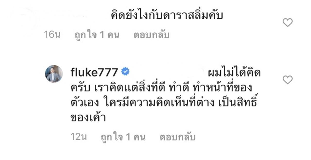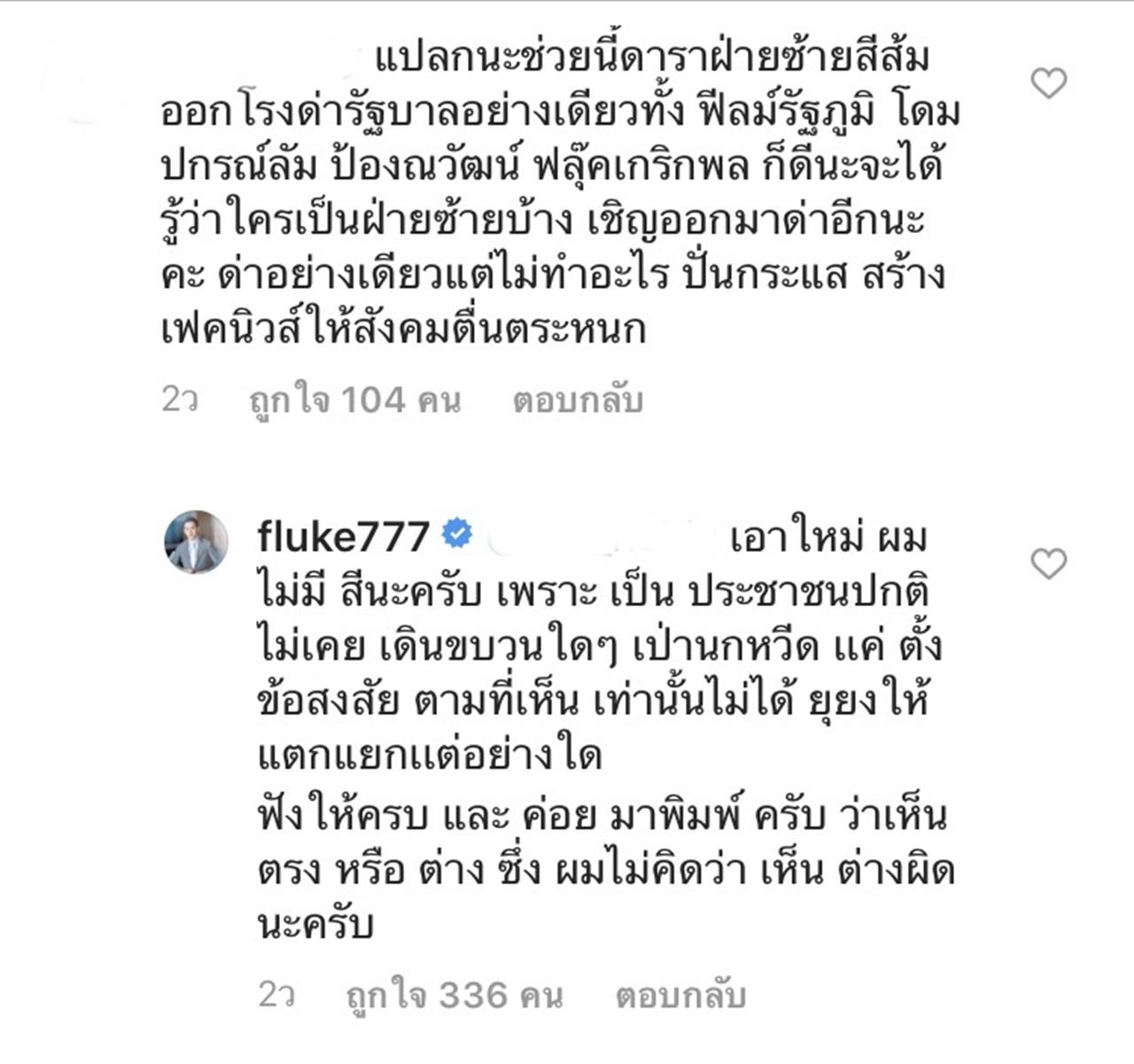 และ ฟลุค ก็ได้เข้าไปตอบทันที โดยบอกว่าตนเองนั้น ไม่มีสี ไม่เคยเดินขบวนหรือเป่านกหวีด ตนเองแค่ตั้งข้อสงสัยตามที่เห็นเท่านั้น ไม่ได้ยุยงก่อให้เกิดความแตกแยกใดๆ