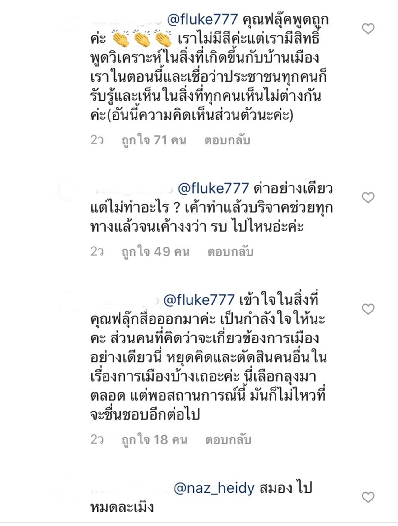 จากนั้นก็มีชาวเน็ตคนหนึ่งได้เข้าไปคอมเม้นต์ว่า "แปลกนะช่วงนี้ ดาราฝ่ายซ้ายสีส้ม ออกโรงด่ารัฐบาลอย่างเดียวทั้ง ฟิลม์ รัฐภูมิ โดม ปกรณ์ลัม ป้อง ณวัฒน์ ฟลุ๊ค เกริกพล ก็ดีนะจะได้รู้ว่าใครเป็นฝ่ายซ้ายบ้าง เชิญออกมาด่าอีกนะคะ ด่าอย่างเดียว แต่ไม่ทำอะไร ปั่นกระแส สร้างเฟคนิวส์ให้สังคมตื่นตระหนก"