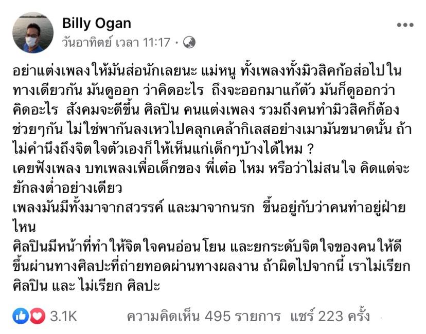 คงสุดจะทนแล้วจริงๆ กับเพลงในสมัยนี้ งานนี้เลยทำให้นักร้องรุ่นใหญ่อีกคนของวงการเพลงอย่าง บิลลี่ โอแกน ต้องออกมาโพสต์เพื่อเตือนสตินักร้องรุ่นใหญ่และคนแต่งเพลงผ่านทางเฟซบุ๊กของตัวเอง โดยบิลลี่ได้โพสต์ข้อความดังนี้