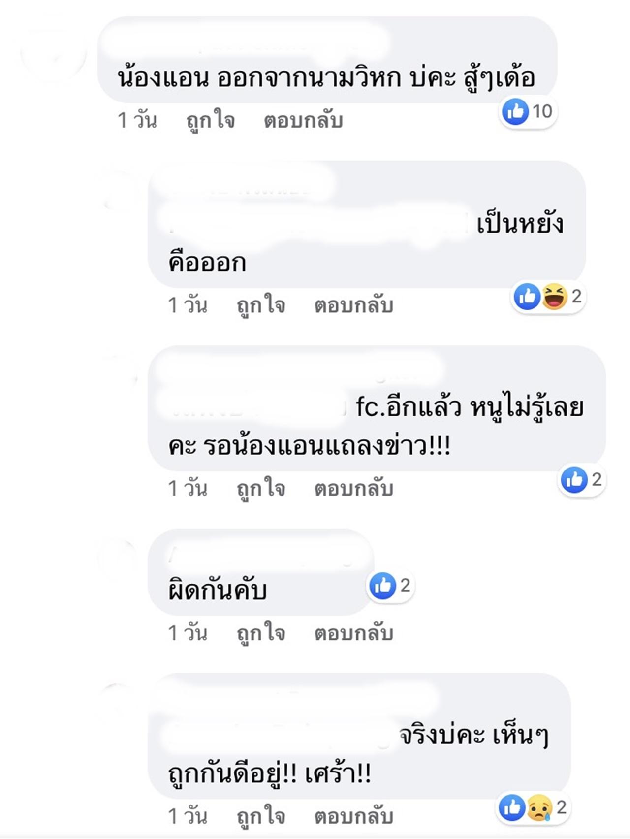 ทำเอาแฟนๆ ที่ติดตามต่างใจหายไปตามๆ กัน และเข้ามาให้กำลังใจเป็นจำนวนมาก ซึ่งทุกคนต่างบอกเป็นเสียงเดียวกันว่า จะตามให้กำลังใจ แอน กันต่อไป อยู่ที่ไหนก็ยังรักเหมือนเดิม ส่วนเหตุผลที่ลาออกจากคณะนั้น แอน ไม่ได้พูดถึง แต่หลายคนมองว่า อาจจะเป็นปัญหาภายในวงก็เป็นได้.