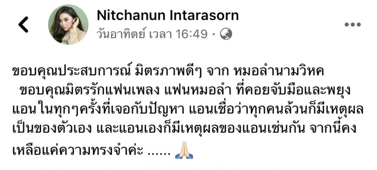 "ขอบคุณประสบการณ์ มิตรภาพดีๆ จาก หมอลำนามวิหค ขอบคุณมิตรรักแฟนเพลง แฟนหมอลำ ที่คอยจับมือและพยุงแอนในทุกๆ ครั้งที่เจอกับปัญหา แอนเชื่อว่าทุกคนล้วนก็มีเหตุผลเป็นของตัวเอง และแอนเองก็มีเหตุผลของแอนเช่นกัน จากนี้คงเหลือแค่ความทรงจำค่ะ"