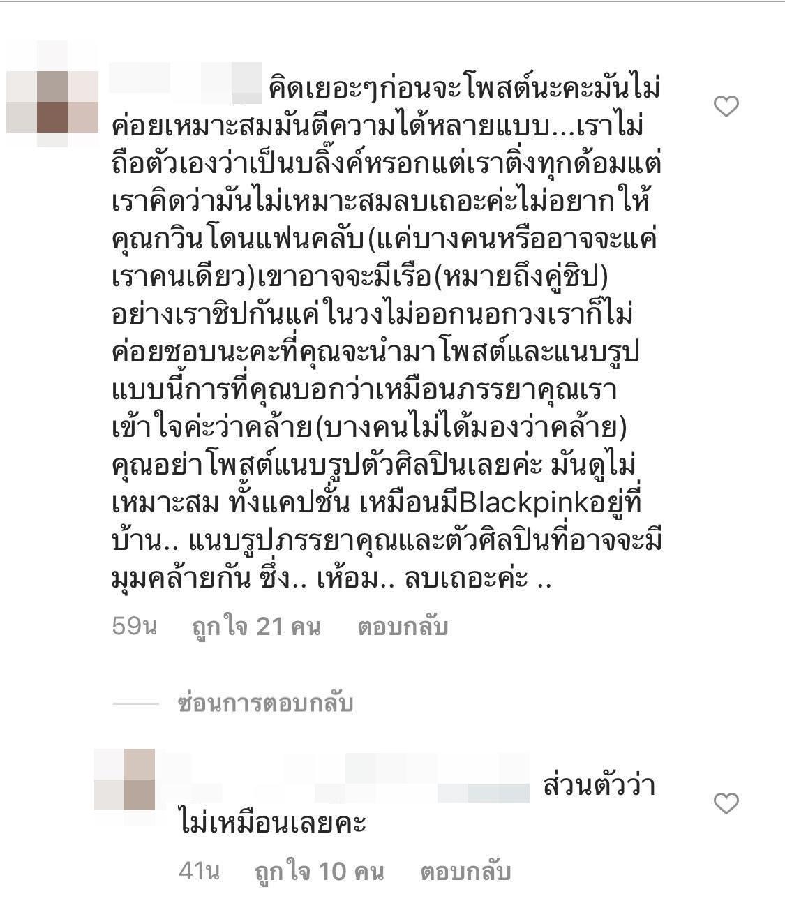 นอกจากนี้ยังมีคนเตือนให้ระวังแฟนคลับ Blackpink หรือ Blink (บลิงก์) เข้ามาว่าด้วย แต่ก็มีแฟนคลับที่เข้ามาชี้แจงว่าบลิงก์ไม่อันธพาลแบบนั้น หลายครั้งที่มีดราม่าก็ไม่ใช่บลิงก์แท้ๆ ที่ก่อเรื่อง เราเป็นบลิงก์ยังคิดว่าน่ารักเลย ฯลฯ.