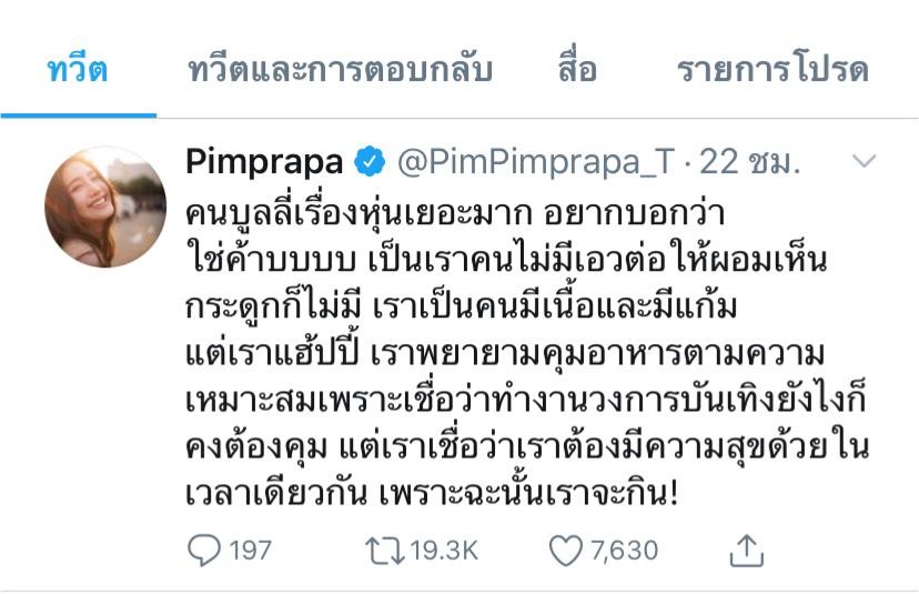 ทำเอาหลายคนถึงกับงงกันไม่น้อย เมื่อนางเอกสาวคนสวย พิม พิมประภา ถูกคนวิพากษ์วิจารณ์และบูลลี่ถึงรูปร่างของเธอ จนทำให้สาวพิมตัดสินใจออกมาทวีตข้อความถึงเรื่องดังกล่าวผ่านทวิตเตอร์ ถึงเรื่องที่ถูกบูลลี่เรื่องหุ่นว่า