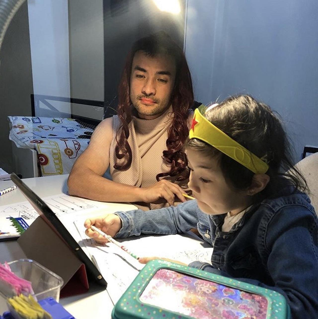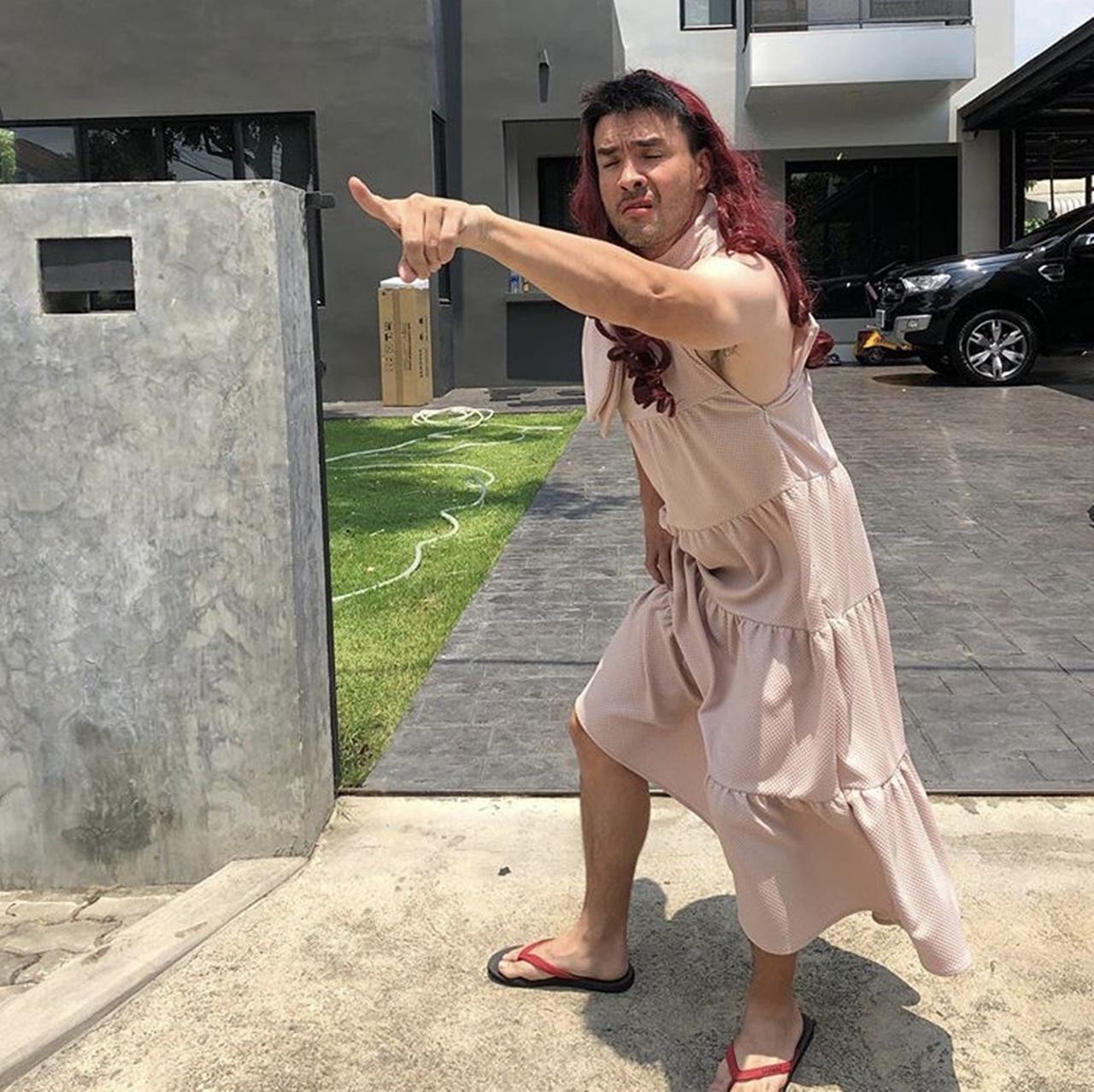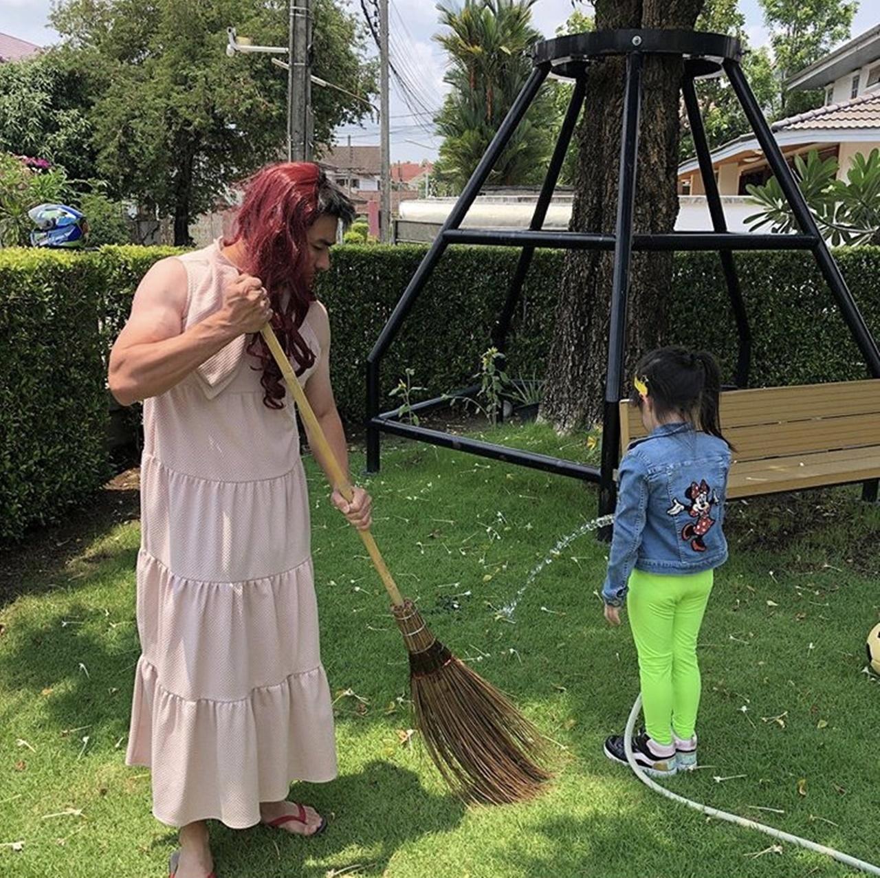 งานนี้ ตั๊ก เลยทำหน้าที่แทนภรรยาช่วยเลี้ยง น้องบีลีฟ ทั้งสอนการบ้าน ทำงานบ้านเอง แต่จะมาแบบปกติได้ไง ถ้าจะทำหน้าที่แม่บ้าน ต้องทำให้เหมือนจริง ตั๊ก เลยแปลงร่างแต่งหญิงสวมวิญญาณเป็นแม่บ้านซะเลย พร้อมกับเขียนแคปชั่นว่า