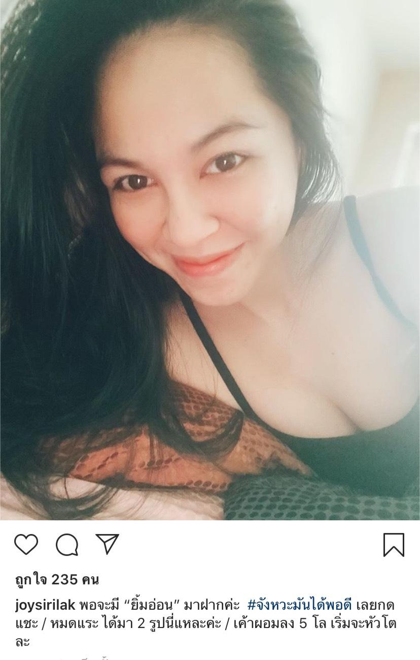 ซึ่งเป็นรูปที่สาวจอยใส่เสื้อสายเดี่ยวสีดำถ่ายรูปกับภาพแสงฟุ้งๆ แถมยังบอกในช่วงอยู่บ้านนั้นน้ำหนักลดไปแล้ว 5 กิโล
