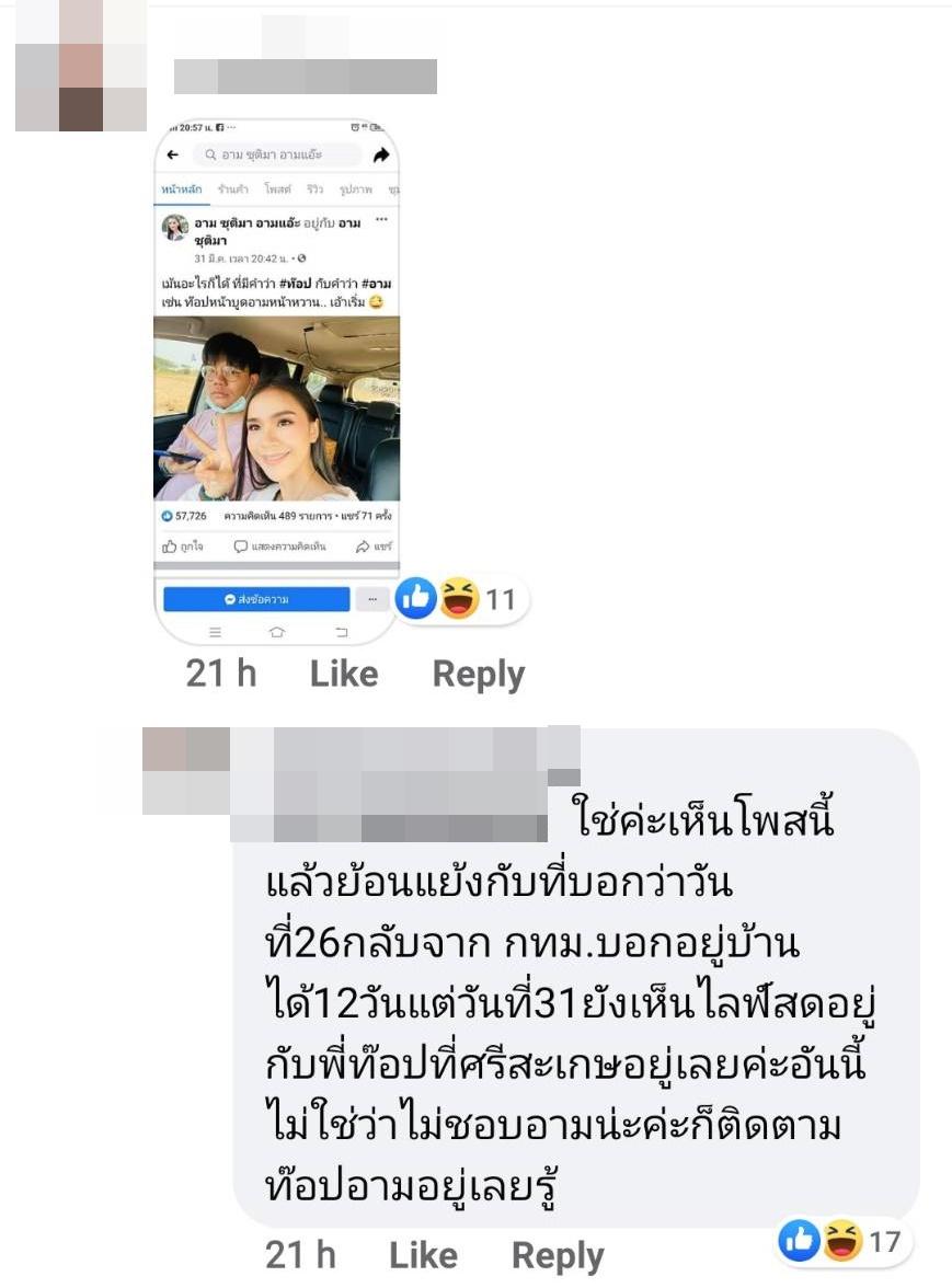 โดยมีแฟนๆ เข้ามาให้กำลังใจ และมีบางส่วนคอมเมนต์บอกให้ฟ้องกลับเพจดังกล่าวที่ปล่อยข่าวดังกล่าว แต่ก็มีชาวเน็ตหลายคนแคปภาพจากเฟซบุ๊กของ อาม ชุติมา ตามสถานที่ต่างๆ ซึ่งระบุเวลาช่วงปลายเดือน มี.ค. และต้นเดือน เม.ย. มาคอมเมนต์และวิจารณ์ บ้างก็บอกว่ามีหลายคนที่เห็นในช่วง 14 วัน อามยังไปสถานที่ต่างๆ ใน จ.บึงกาฬ อีกทั้งยังไลฟ์สดกับ ท็อป มอซอ ที่ จ.ศรีสะเกษ เมื่อวันที่ 31 มี.ค. ที่ผ่านมา และรอให้นักร้องดังชี้แจงด้วย.