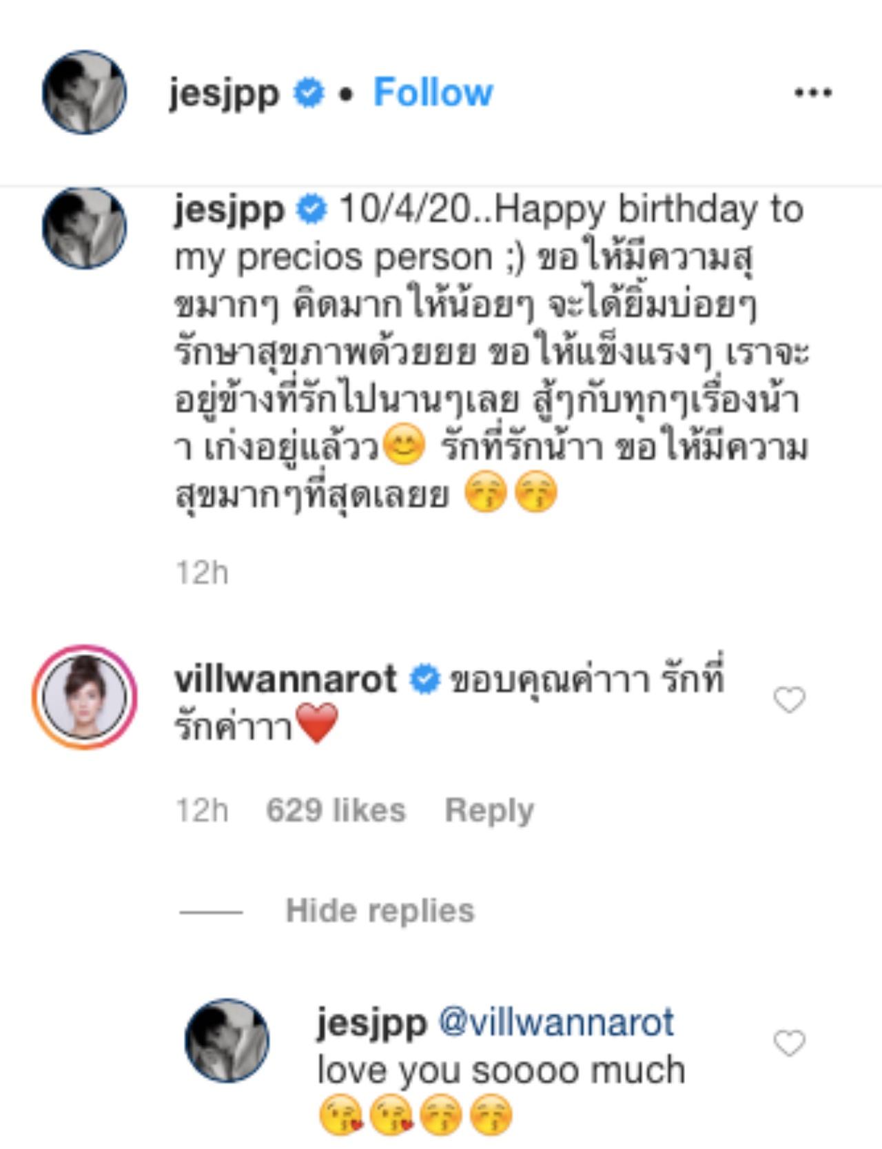 แต่แค่นั้นยังหวานไม่พอเพราะพอแฟนหนุ่มมาอวยพรวันเกิด วิว วรรณรท ก็ตอบกับสุดหวานกว่า "ขอบคุณค่าาา รักที่รักค่าาา" และ เจษ ก็มาตอบกลับอีก "love you soooo much"