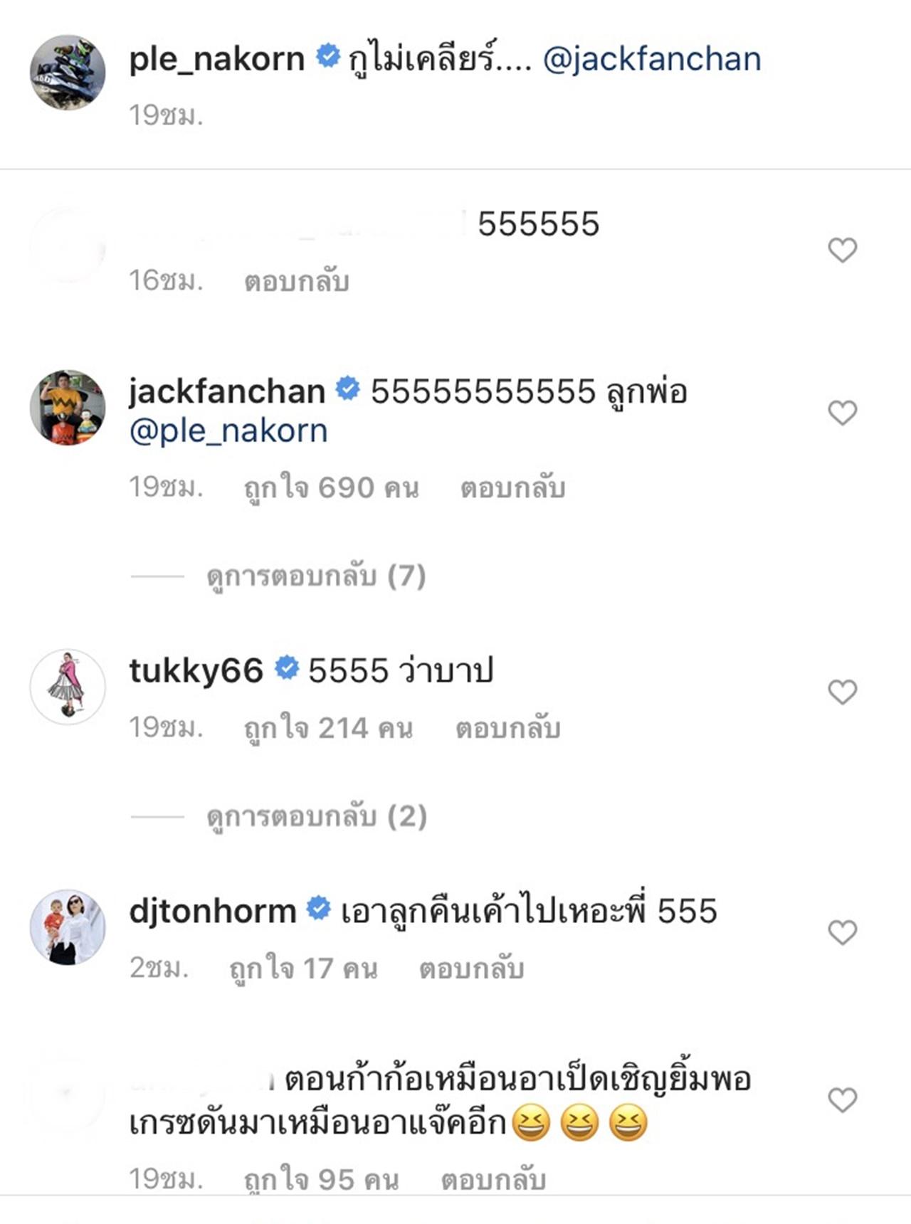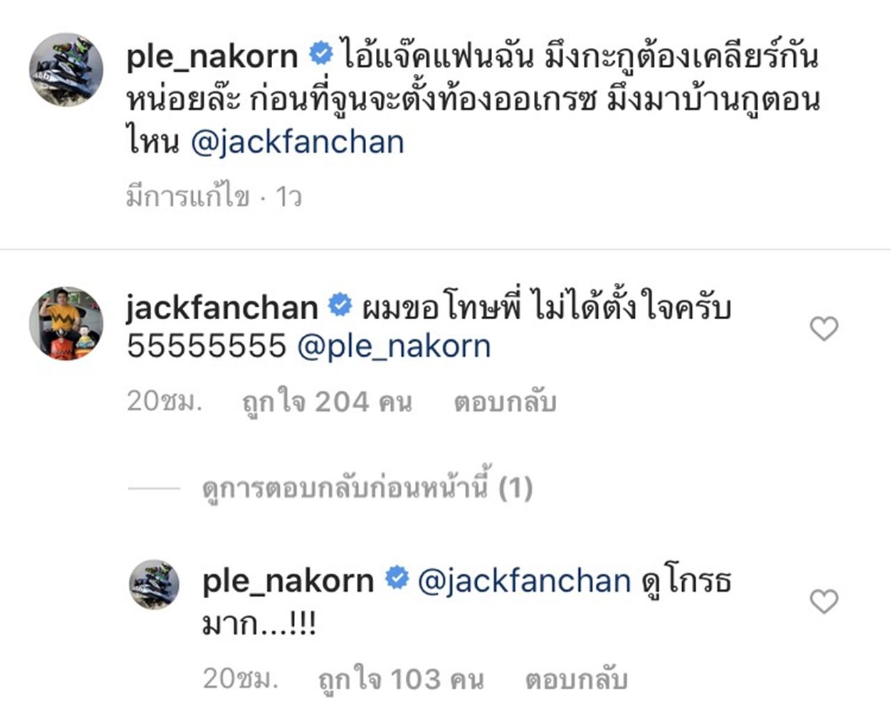 "ไอ้แจ๊คแฟนฉัน มึงกะกูต้องเคลียร์กันหน่อยล๊ะ ก่อนที่จูนจะตั้งท้องออเกรซ มึงมาบ้านกูตอนไหน @jackfanchan" ซึ่ง แจ๊ค ก็ได้เข้ามาตอบกลับว่า "ผมขอโทษพี่ ไม่ได้ตั้งใจครับ 55555555"