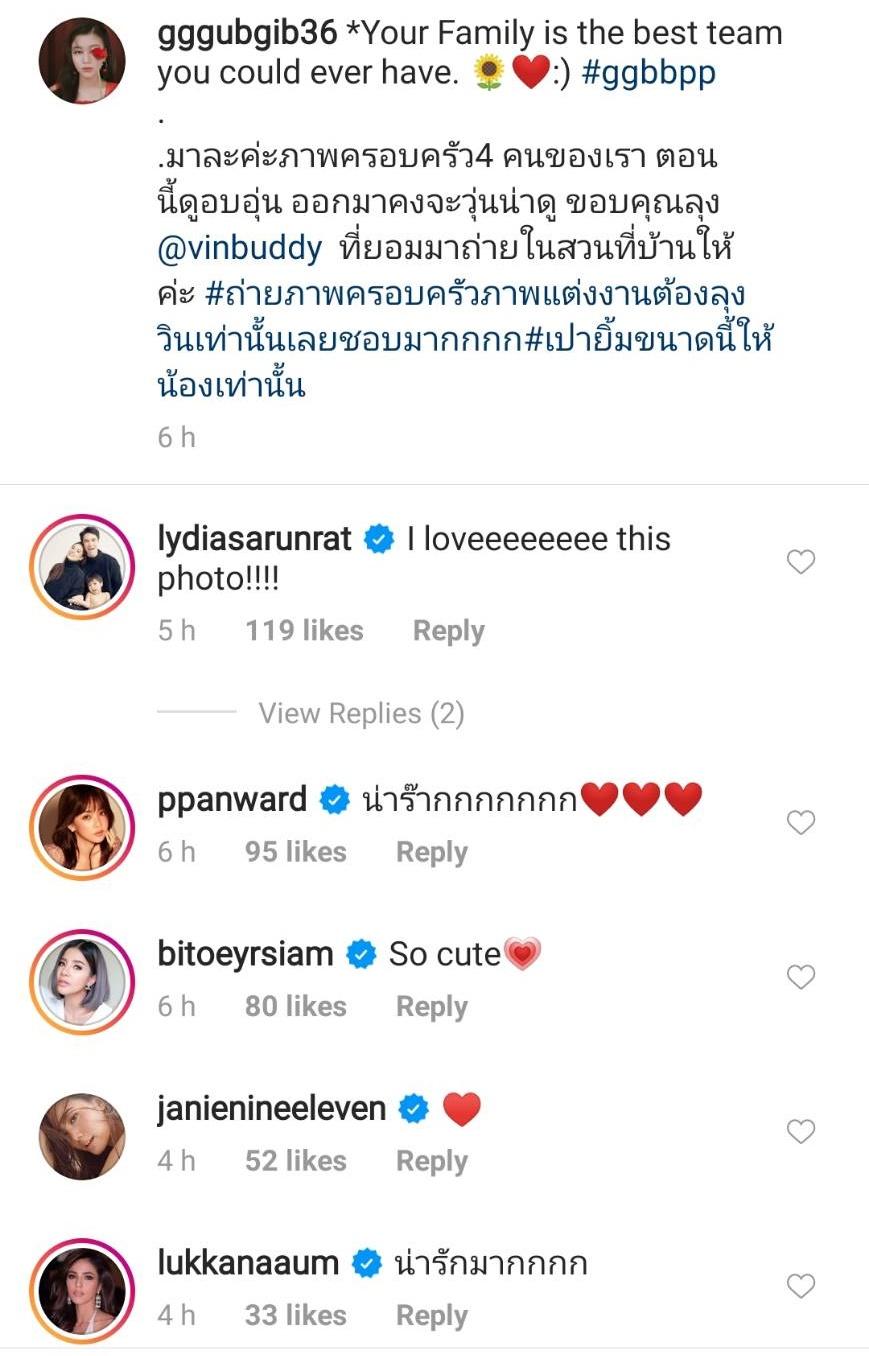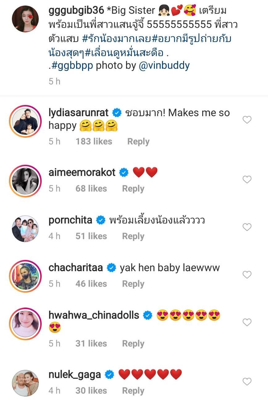 ทำเอาแฟนๆ ที่ได้เห็นต่างบอกว่าน่ารักอบอุ่นมาก ปาอีโมจิหัวใจรัวๆ บ้างก็แซวว่าน้องเป่าเปาอยากโชว์พุงเหมือนแม่ ส่วนคนบันเทิงต่างคอมเมนต์ถูกอกถูกใจกับภาพเซตนี้กันใหญ่ โดยเฉพาะ ลีเดีย ศรัณย์รัชต์ ที่ถึงกับบอกว่า “I loveeeeeeee this photo!!!!” และ “ชอบมาก! Makes me so happy”.