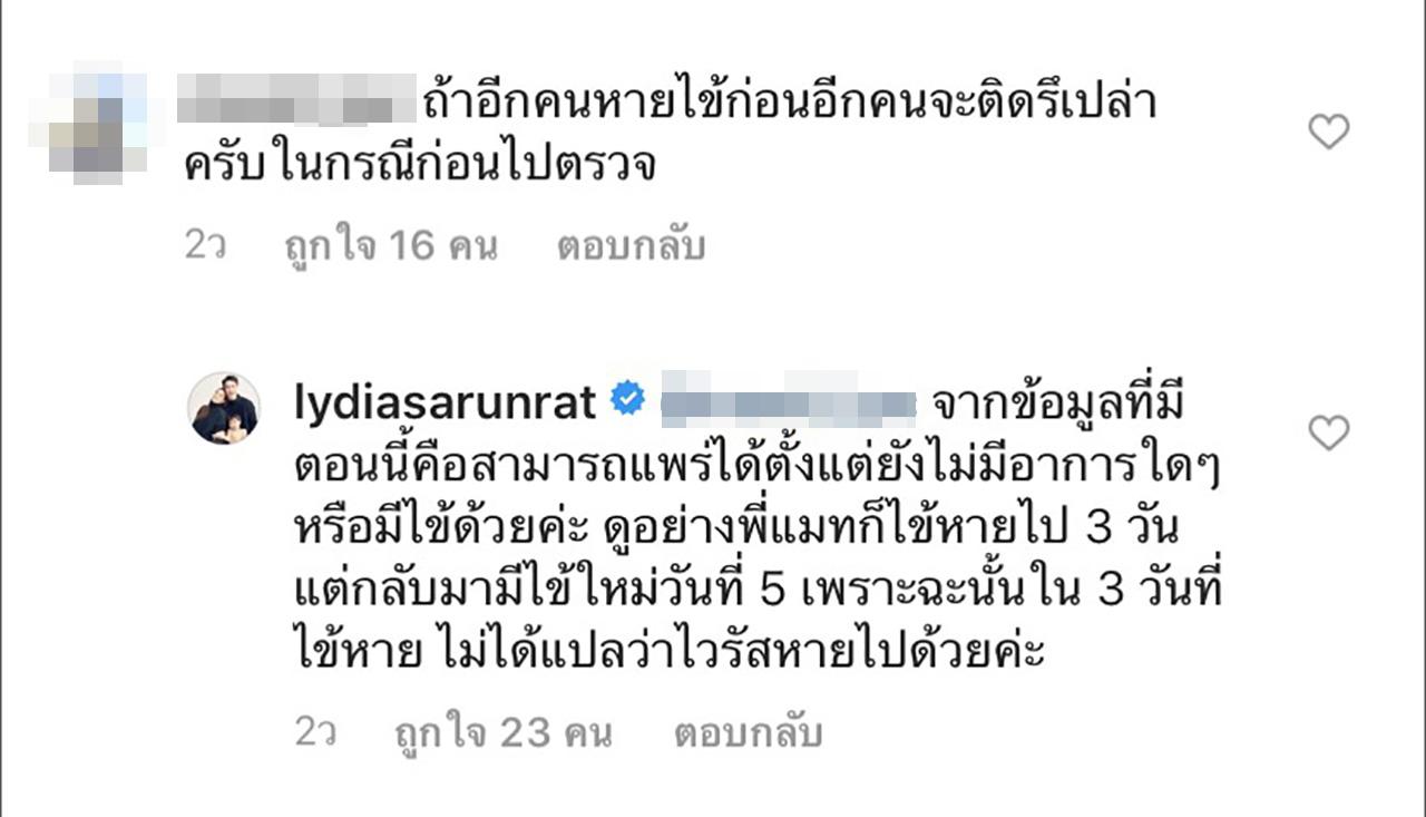 ลีเดียตอบคำถามเรื่องนี้ว่า จากข้อมูลที่มี ตอนนี้คือสามารถแพร่ได้ตั้งแต่ยังไม่มีอาการใดๆ หรือมีไข้ด้วยค่ะ ดูอย่างพี่แมทก็ไข้หายไป 3 วันแล้ว แต่กลับมามีไข้ใหม่วันที่ 5 เพราะฉะนั้นในวันที่ 3 ที่ไข้หาย ไม่ได้แปลว่าไวรัสหายไปด้วยค่ะ