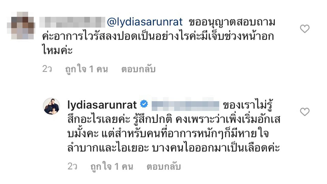 และ ลีเดีย กับ แมทธิว ก็มักจะอัปเดตการรักษาให้แฟนๆ ได้ทราบกันอยู่ตลอดอีกด้วย เพราะเหตุนี้จึงมีชาวเน็ตหลายคนที่มีคำถามที่อยากจะรู้เกี่ยวกับเชื้อไวรัสโควิด-19 นี้ เข้ามาคอมเมนต์ถามกับสาวลีเดียมากมาย ซึ่งเจ้าตัวก็ยินดีพร้อมที่จะให้ข้อมูลเท่าที่ได้รับมาจากหมอให้แฟนๆ ได้ทราบ