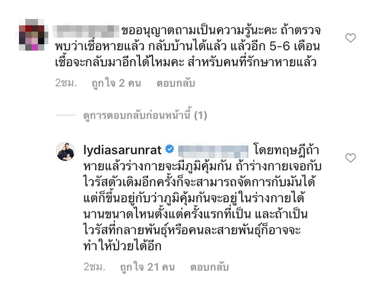 ซึ่งลีเดียได้ตอบเรื่องนี้ว่า โดยทฤษฎีถ้าหายแล้ว ร่างกายจะมีภูมิคุ้มกัน ถ้าร่างกายเจอกับไวรัสตัวเดิมอีกครั้งก็จะสามารถจัดการกับมันได้ แต่ก็ขึ้นอยู่กับว่าภูมิคุ้มกันจะอยู่ในร่างกายได้นานขนาดไหนตั้งแต่แรกที่เป็น และถ้าเป็นไวรัสที่กลายพันธุ์ หรือคนละสายพันธุ์ก็อาจทำให้ป่วยได้อีก