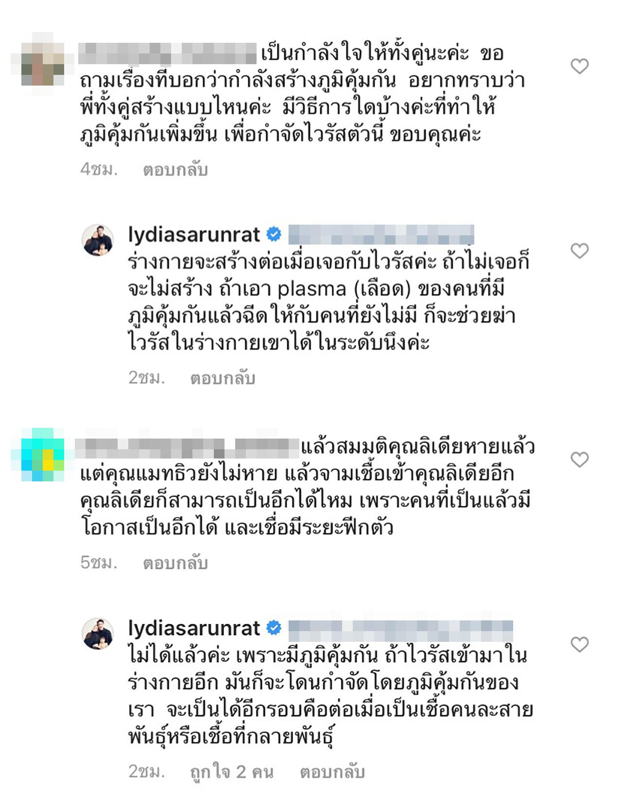 ซึ่งลีเดียได้ตอบว่า ร่างกายจะสร้างต่อเมื่อเจอกับไวรัส ถ้าไม่เจอก็จะไม่สร้าง เอา Plasma (เลือด) ของคนที่มีภูมิคุ้มกันแล้วฉีดให้กับคนที่ยังไม่มี ก็จะช่วยฆ่าไวรัสในร่างกายได้ระดับนึง