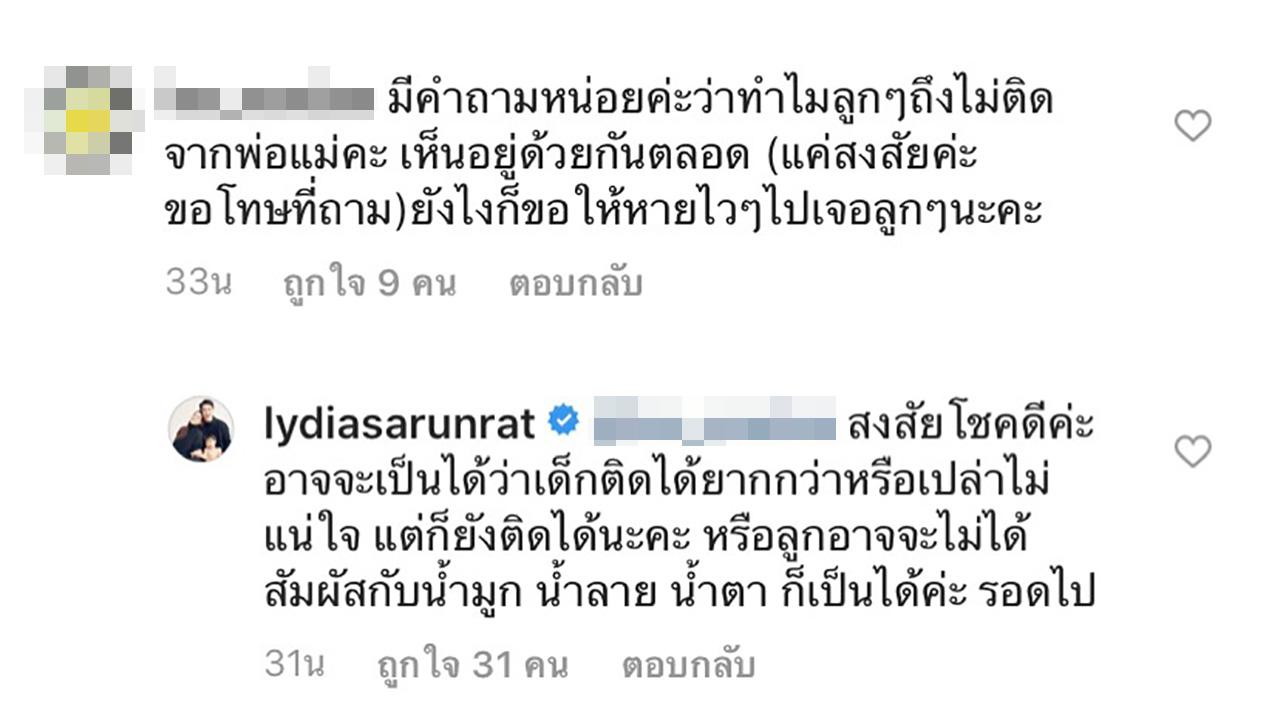 และลีเดียได้ตอบว่า สงสัยโชคดีค่ะ อาจจะเป็นได้ว่าเด็กติดได้ยากกว่าหรือเปล่า ไม่แน่ใจ แต่ก็ยังติดได้นะคะ หรือลูกอาจจะไม่ได้สัมผัสกับน้ำมูก น้ำลาย น้ำตา ก็เป็นได้ รอดไป