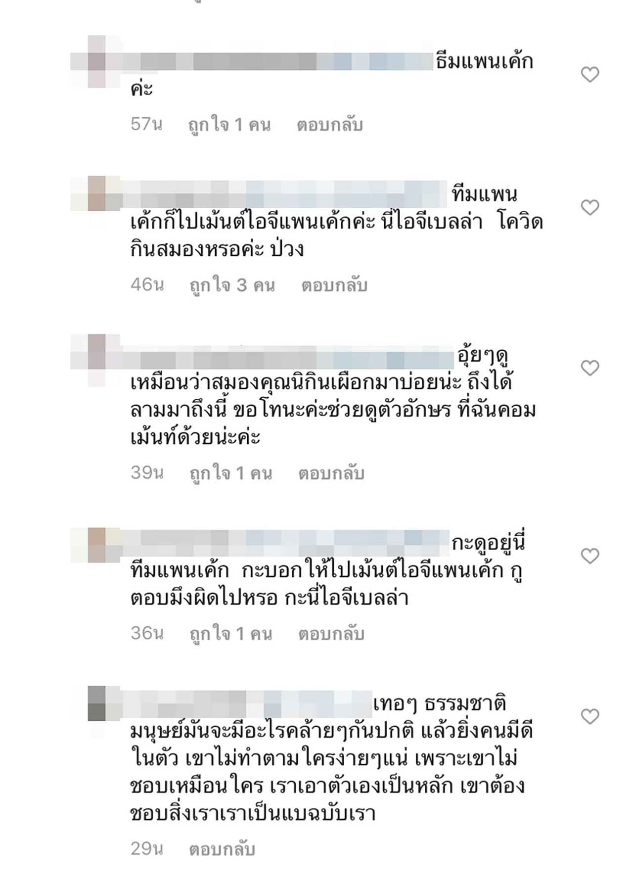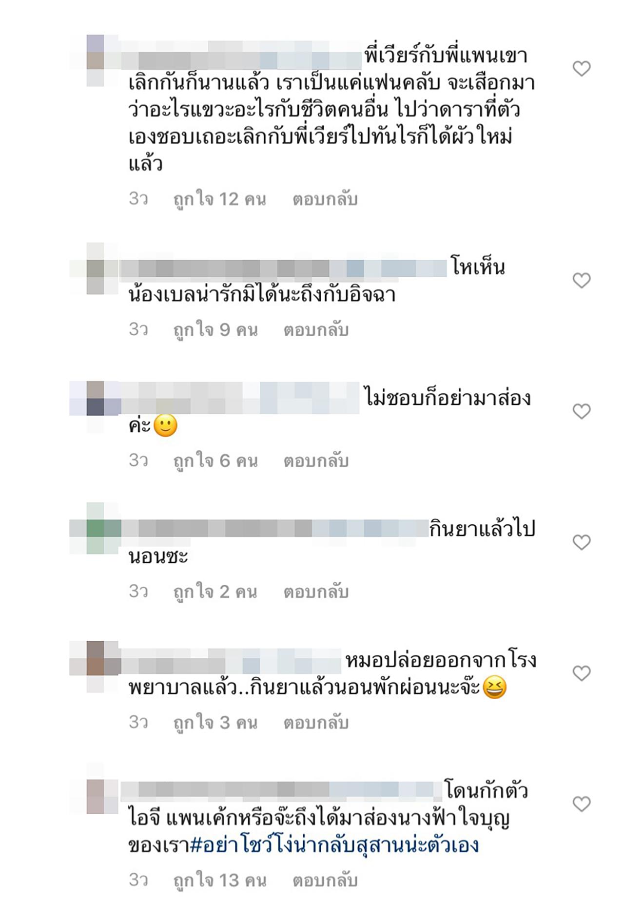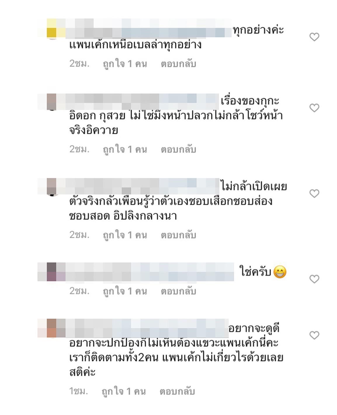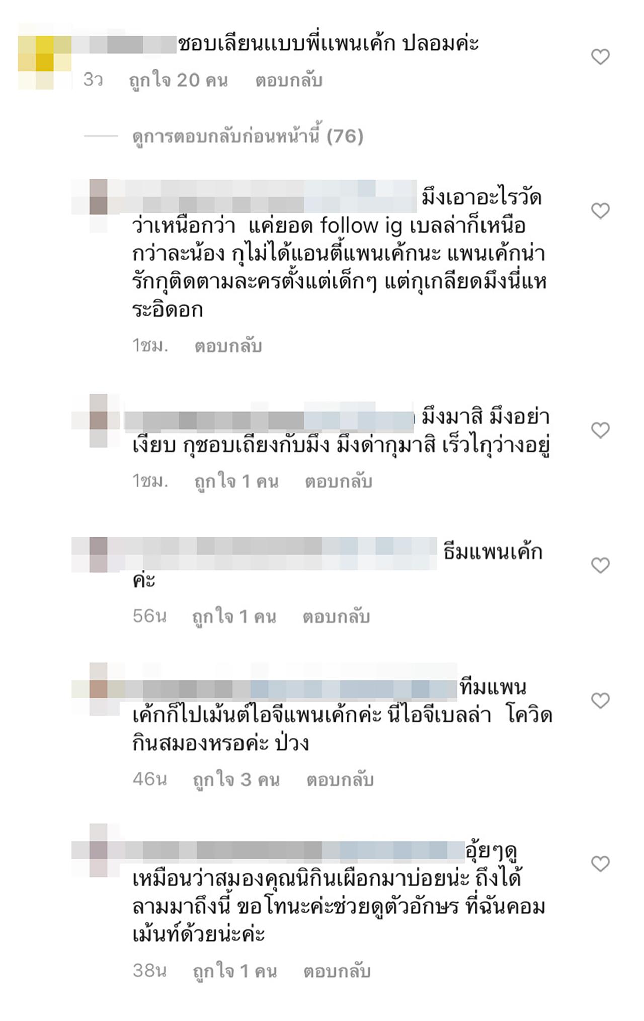ซึ่งหลังจากที่ชาวเน็ตคนดังกล่าวคอมเมนต์ข้อความนี้ไป ก็มีเหล่าบรรดาแฟนคลับของสาวเบลล่าเข้ามาคอมเมนต์ต่อว่าชาวเน็ตคนดังกล่าวมากมาย โดยบอกว่า ถ้าเป็นแฟนคลับแพนเค้กก็ไปเมนต์ที่ไอจีแพนเค้ก ถ้าเมนต์ดีๆ ไม่ได้ก็อย่าเมนต์เลย ระวังจะโดนเอฟซีออเจ้ารุมเอานะ และควรจะให้เกียรติดาราคนอื่นด้วย