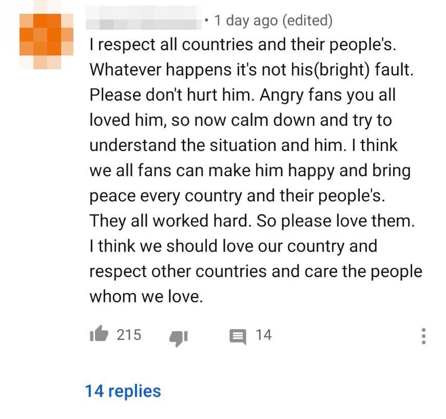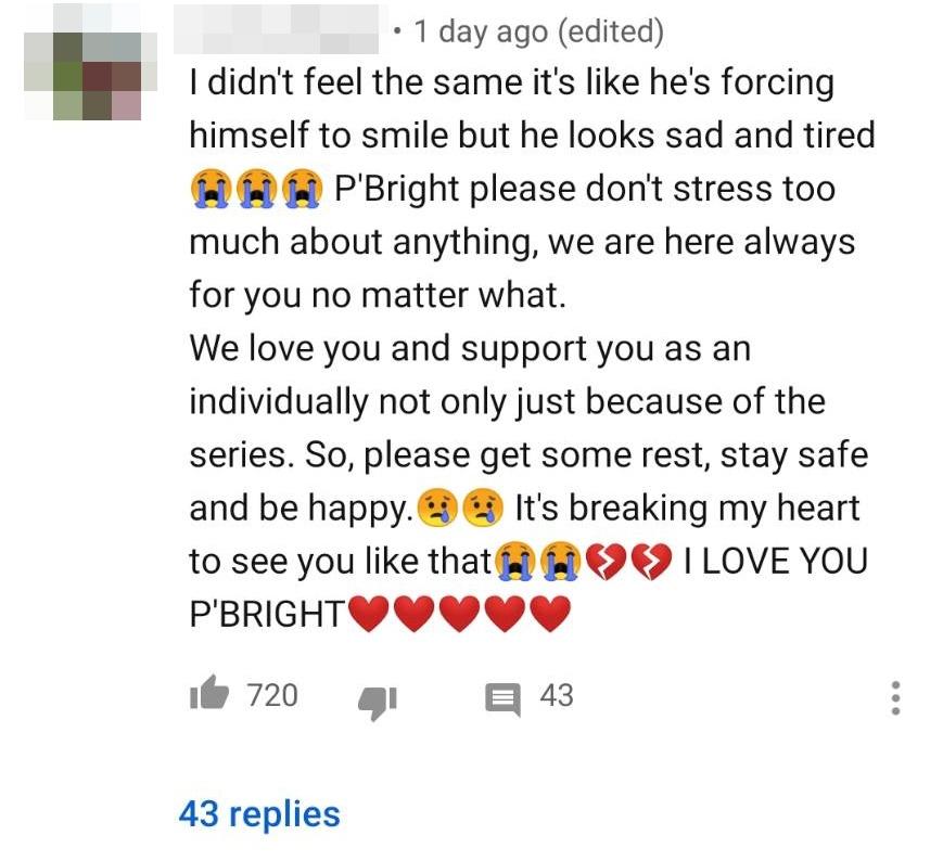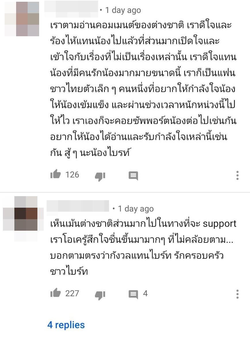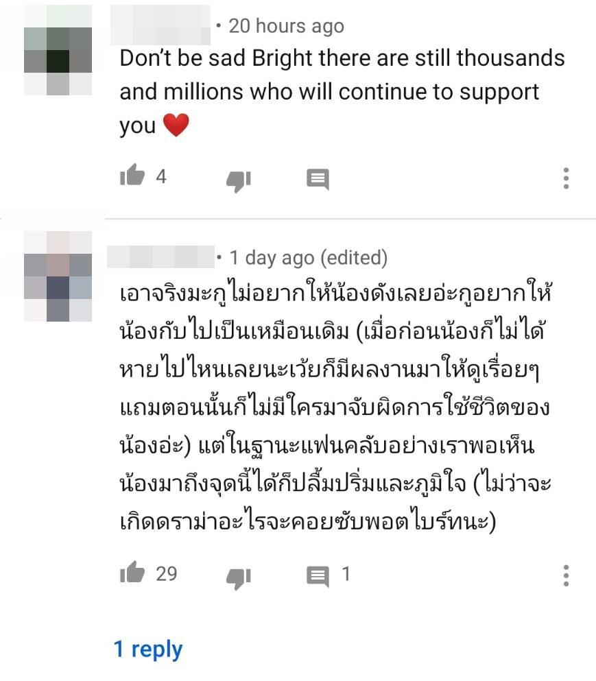 อีกทั้งยังมีแฟนคลับชาวต่างชาติเข้ามาคอมเมนต์ทำนองว่าเห็นสายตาของไบร์ทดูเศร้าและเครียดแล้วรู้สึกเป็นห่วง พร้อมทั้งบอกว่าอย่าคิดมากกับทุกอย่าง บ้างก็บอกว่าพร้อมที่จะซัพพอร์ต และไบร์ทไม่ได้ทำอะไรผิด