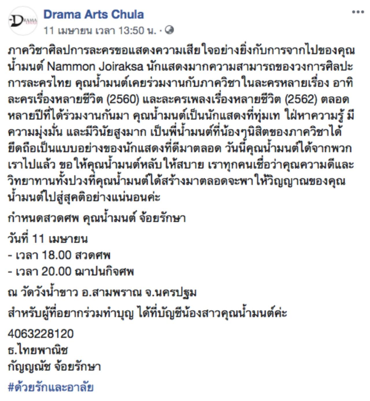 โดยเพจ Drama Arts Chula ได้โพสต์อาลัยว่า "ภาควิชาศิลปการละครขอแสดงความเสียใจอย่างยิ่งกับการจากไปของคุณน้ำมนต์ Nammon Joiraksa นักแสดงมากความสามารถของวงการศิลปะการละครไทย คุณน้ำมนต์เคยร่วมงานกับภาควิชาในละครหลายเรื่อง อาทิ ละครเรื่องหลายชีวิต (2560) และละครเพลงเรื่องหลายชีวิต (2562)