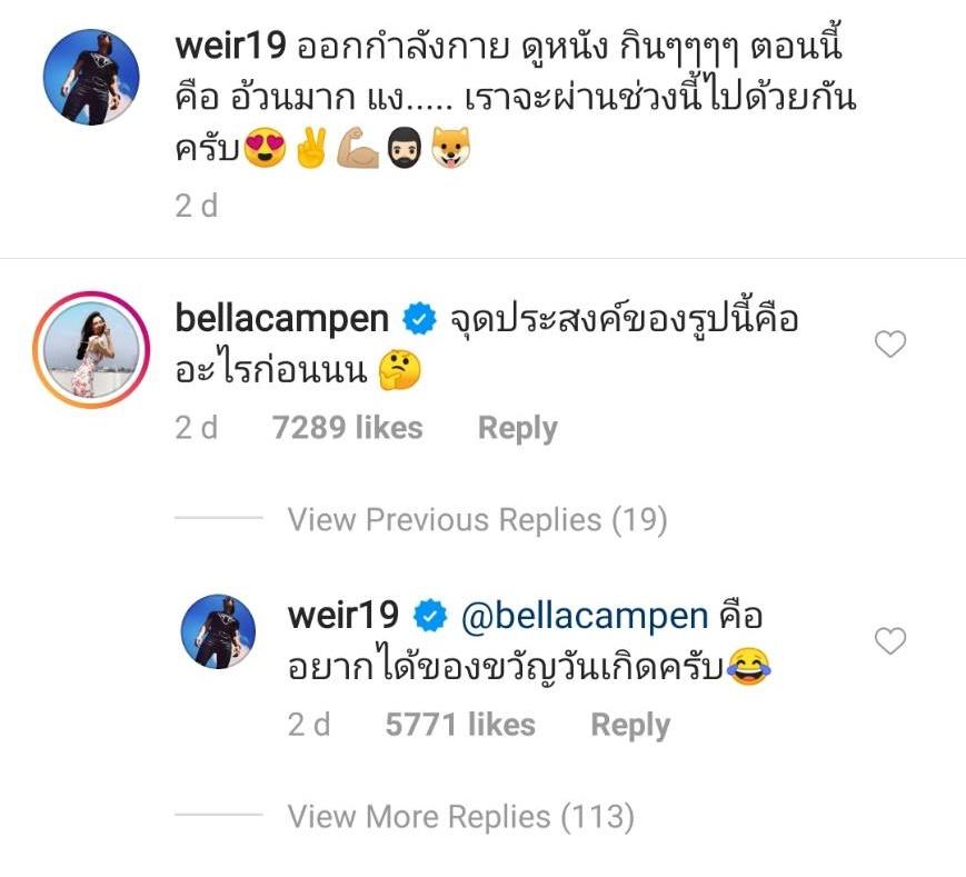 แต่ที่พีคสุดเห็นจะเป็นคอมเมนต์จากหวานใจอย่างนางเอกสาวฮอตวิก 3 เบลล่า ราณี แคมเปน ที่เข้ามาเบรกด้วยคำถามสุดพีค “จุดประสงค์ของรูปนี้คืออะไรก่อนนน” พร้อมทั้งใส่อีโมจิทำท่าคิด และ เวียร์ ตอบกลับว่า “คืออยากได้ของขวัญวันเกิดครับ” และใส่อีโมจิรูปหัวเราะน้ำตาไหล
