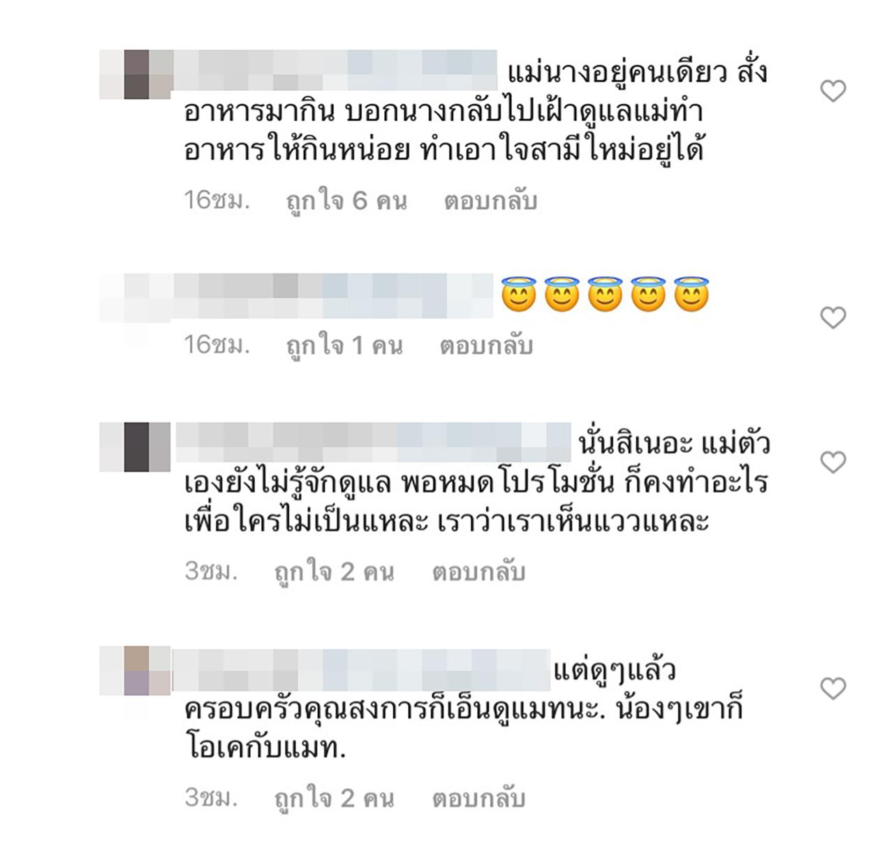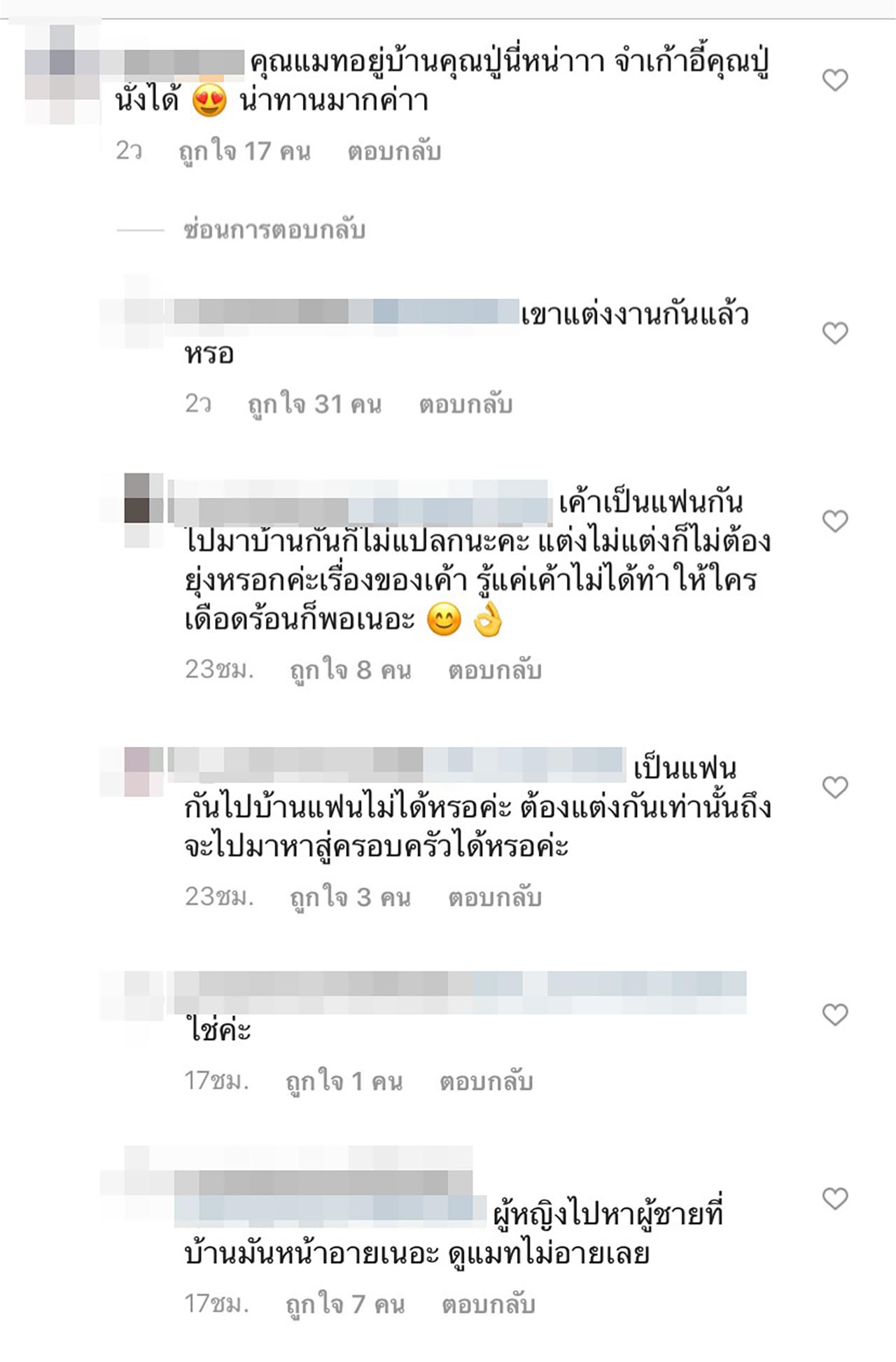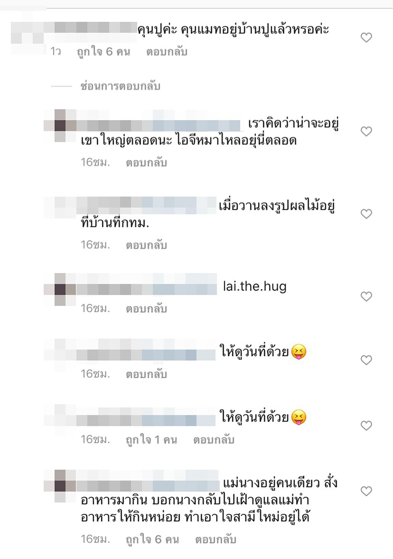 ซึ่งชาวเน็ตคนดังกล่าวก็คอมเมนต์ตอบกลับว่า "เมื่อวานลงรูปผลไม้อยู่ที่บ้าน กทม." และคอมเมนต์ต่อว่า "แม่นางอยู่คนเดียว สั่งอาหารมากิน บอกนางกลับไปเฝ้าดูแลแม่ทำอาหารให้กินหน่อย ทำเอาใจสามีใหม่อยู่ได้"