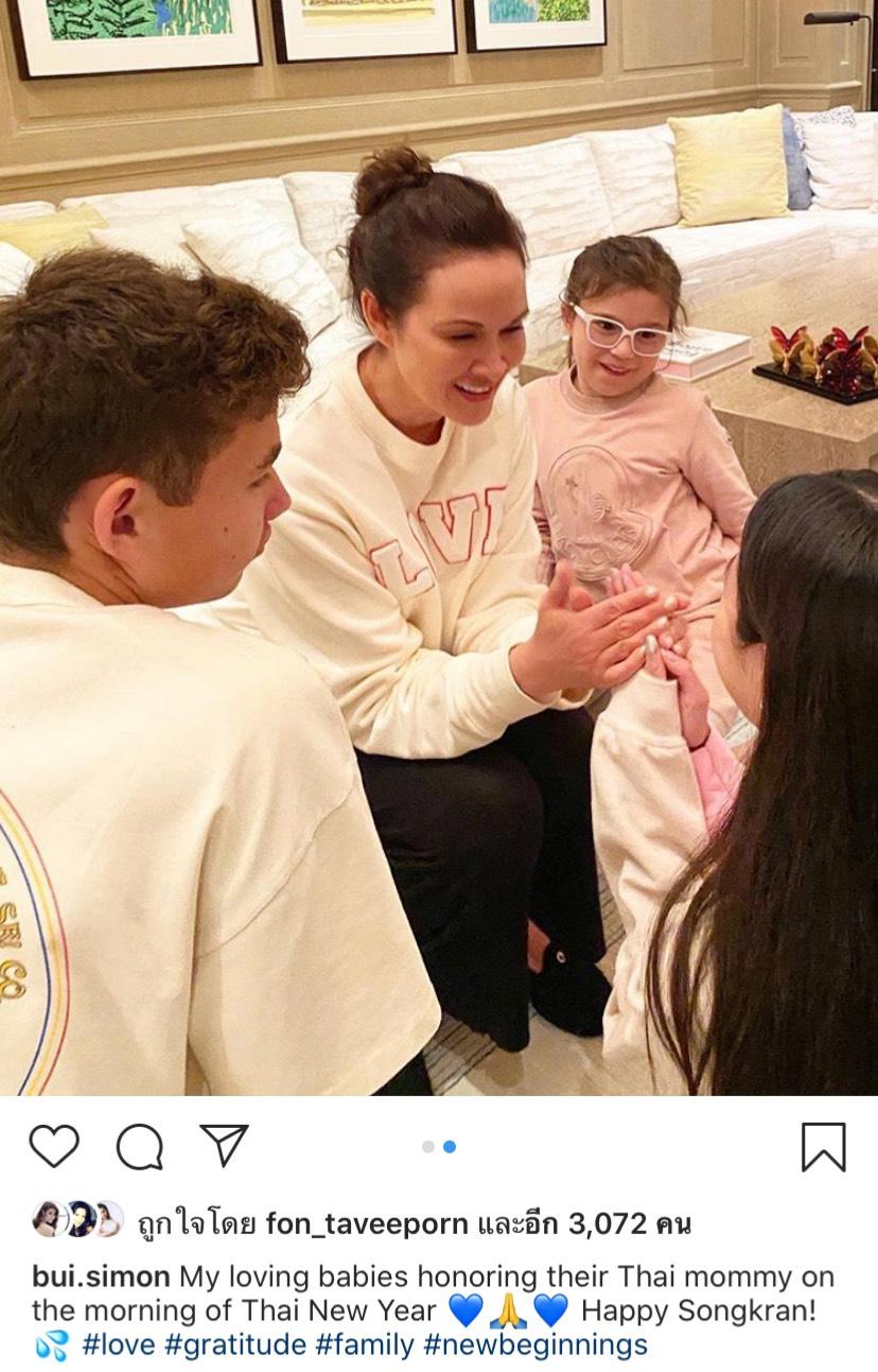 และงานนี้ ลูกๆ ของ ปุ๋ย ภรณ์ทิพย์ ก็ไม่ลืมความเป็นไทย เพราะได้ทำการรดน้ำขอพรจากแม่ ทำเอาสาวปุ๋ยถึงกับเป็นปลื้ม พร้อมกับโพสต์รูปและเขียนแคปชั่นว่า “my loving babies honoring their Thai mommy on the morning of Thai new year Happy Songkran!” (ลูกๆ ของฉันแสดงความเคารพ (กราบรดน้ำดำหัว) แม่คนไทยของพวกเค้าในวันปีใหม่ไทย)