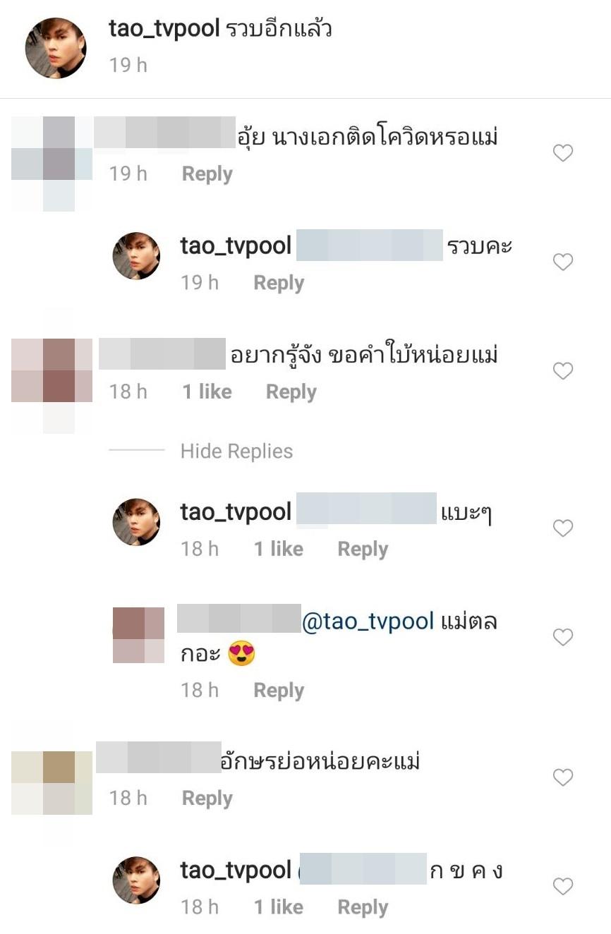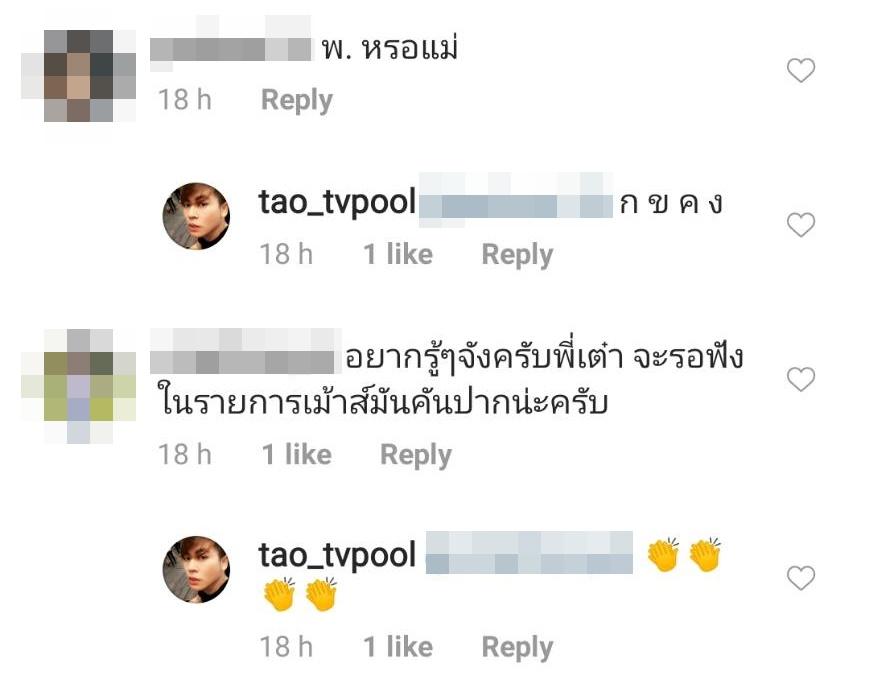 งานนี้เลยมีขาเผือกตั้งข้อสงสัยในไอจีกันยกใหญ่ บอกว่าอยากรู้จัง ขอคำใบ้หน่อย แต่ เต๋า ทีวีพูล ตอบกลับแค่ว่า “แบะๆ” บ้างก็บอกขออักษรย่อหน่อย บางคนถามว่า พ. เหรอแม่ และ เต๋า ทีวีพูล ตอบกลับแบบฮาๆ ว่า “ก ข ค ง”