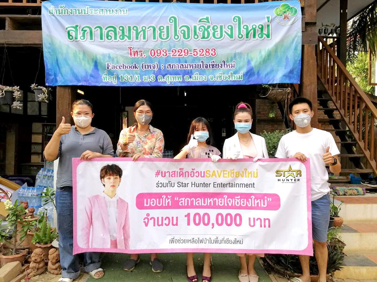เนื่องด้วยจังหวัดเชียงใหม่ซึ่งเป็นบ้านเกิดของ บาส-สุรเดช พินิวัตร์ หรือ บาส SBFIVE หนึ่งในสมาชิก SBFIVE สังกัด Star Hunter Entertainment ได้เกิดวิกฤติไฟป่า โหมไหม้ลุกลามอุทยานแห่งชาติดอยสุเทพ-ปุย เป็นเวลายาวนานหลายสัปดาห์แล้ว และด้วยสำนึกรักบ้านเกิด บาส SBFIVE ผุดแคมเปญ #บาสเด็กอ้วน Save เชียงใหม่ ขอเป็นสื่อกลางรับบริจาคเงิน ช่วยเหลือสถานการณ์ไฟป่าในพื้นที่ จ.เชียงใหม่ ได้ยอดเงินบริจาค 100,000 บาท โดยคุณแพรน้ำฝน และ ด.ญ.แพรไพลิน พินิวัตร์ คุณแม่และน้องสาว เป็นตัวแทนบาส SBFIVE บริจาคเงินให้ “สภาลมหายใจเชียงใหม่” เพื่อใช้ในการเยียวยาวิกฤติครั้งนี้