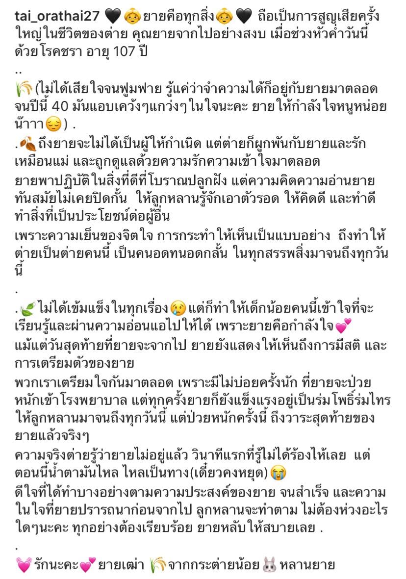 โดย ต่าย อรทัย ได้บอกข่าวนี้ผ่านอินสตาแกรมของตัวเองว่า "ยายคือทุกสิ่ง ถือเป็นการสูญเสียครั้งใหญ่ในชีวิตของต่าย คุณยายจากไปอย่างสงบ เมื่อช่วงหัวค่ำววันนี้ ด้วยโรคชรา อายุ 107 ปี