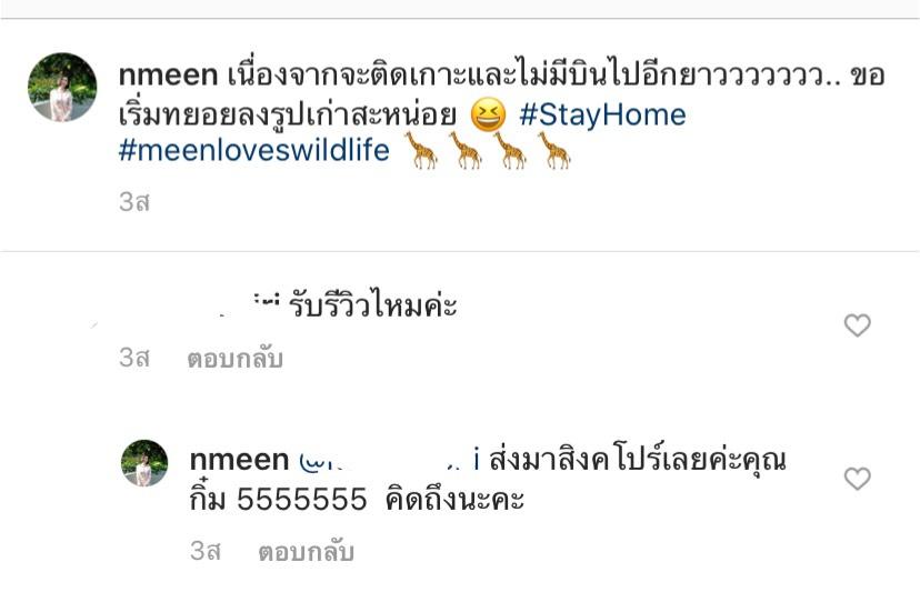และล่าสุดสาวมีน หวานใจของหนุ่มต่อ ธนภพ ก็ได้โพสต์อินสตาแกรมของตัวเองว่า ไม่ได้บินมาครบ 1 เดือนแล้ว และตอนนี้ก็ยังกลับประเทศไทยไม่ได้ ยังติดเกาะอยู่ที่ประเทศสิงคโปร์ ทำเอาเจ้าตัวคิดถึงบ้านมากๆ หลังจากที่สาวมีนอัปเดตชีวิตของตัวเองไป ก็มีเพื่อนๆ แฟนๆ เข้าไปคอมเมนต์พูดคุยและบอกให้สาวมีนดูแลตัวเองให้ดี