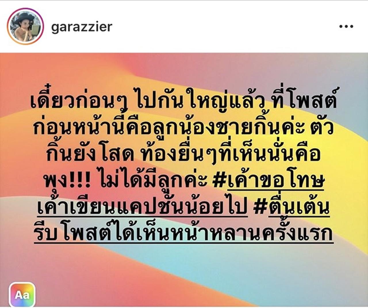 และ กิ้น ก็ได้โพสต์อธิบายเพิ่มเติมว่า "เดี๋ยวก่อนๆ ไปกันใหญ่แล้วที่โพสต์ ก่อนหน้านี้คือลูกน้องชายกิ้นค่ะ ตัว กิ้นยังโสด ท้องยื่นๆ ที่เห็นนั่นคือ พุง!!! ไม่ได้มีลูกค่ะ #เค้าขอโทษ เค้าเขียนแคปชั้นน้อยไป #ตื่นเต้น รีบโพสต์ได้เห็นหน้าหลานครั้งแรก" ซึ่งเพื่อนๆ และคนที่ติดตาม ต่างก็ขำกันยกใหญ่ เพราะตกอกตกใจกันหมดว่าตกข่าวอะไรไปรึเปล่าน้า.