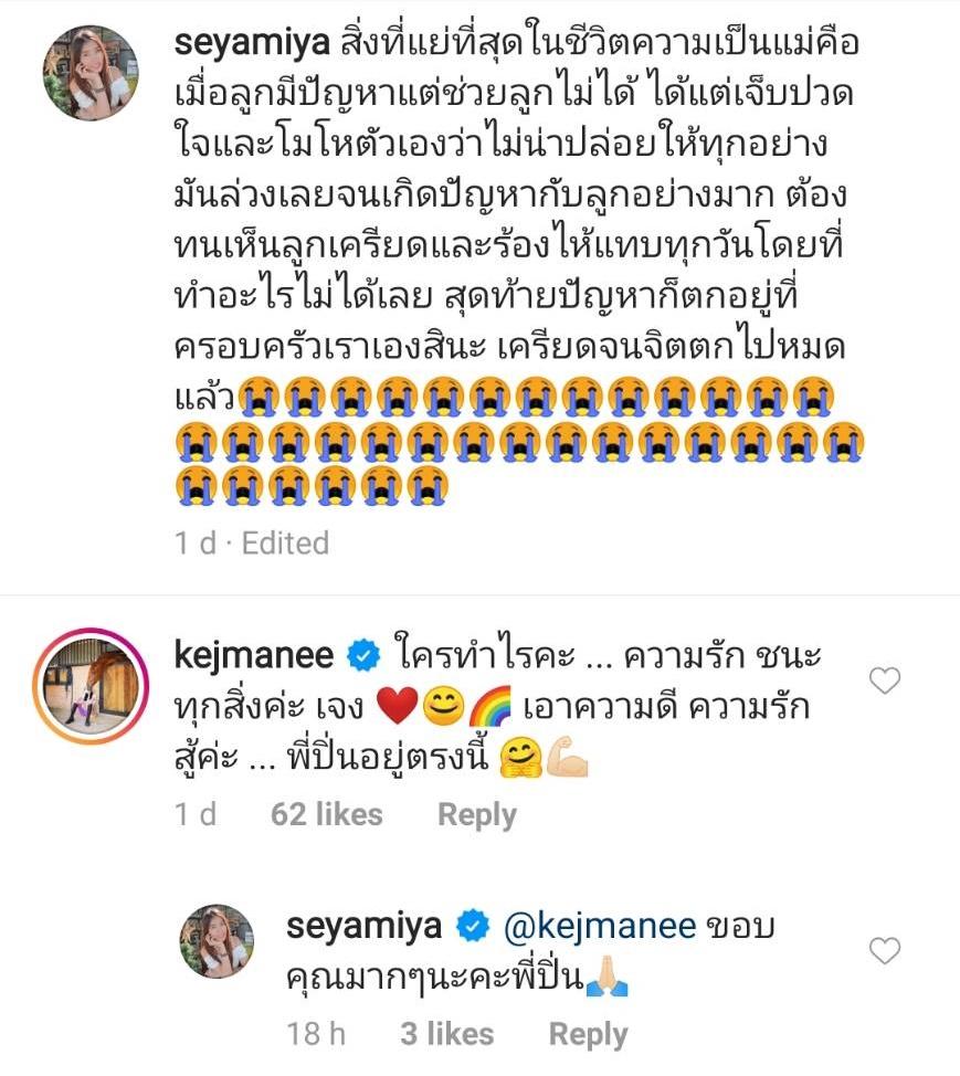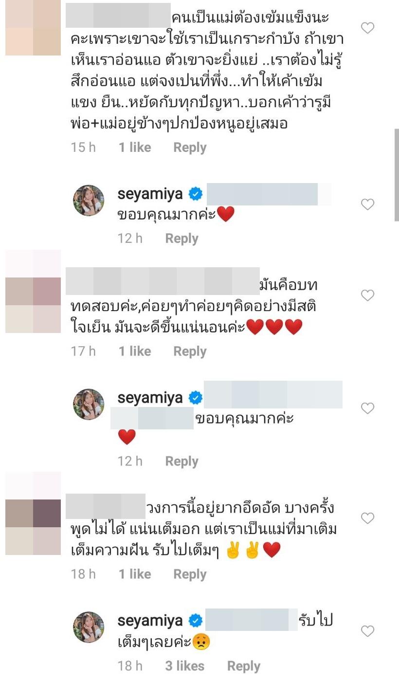จากนั้นก็มีแฟนๆ หลายคนเข้ามาคอมเมนต์ให้กำลังใจครอบครัว บ้างก็บอกว่าคนเป็นแม่ต้องเข้มแข็ง เพราะลูกจะใช้เราเป็นเกราะกำบัง ถ้าเขาเห็นเราอ่อนแอ เขาจะยิ่งแย่