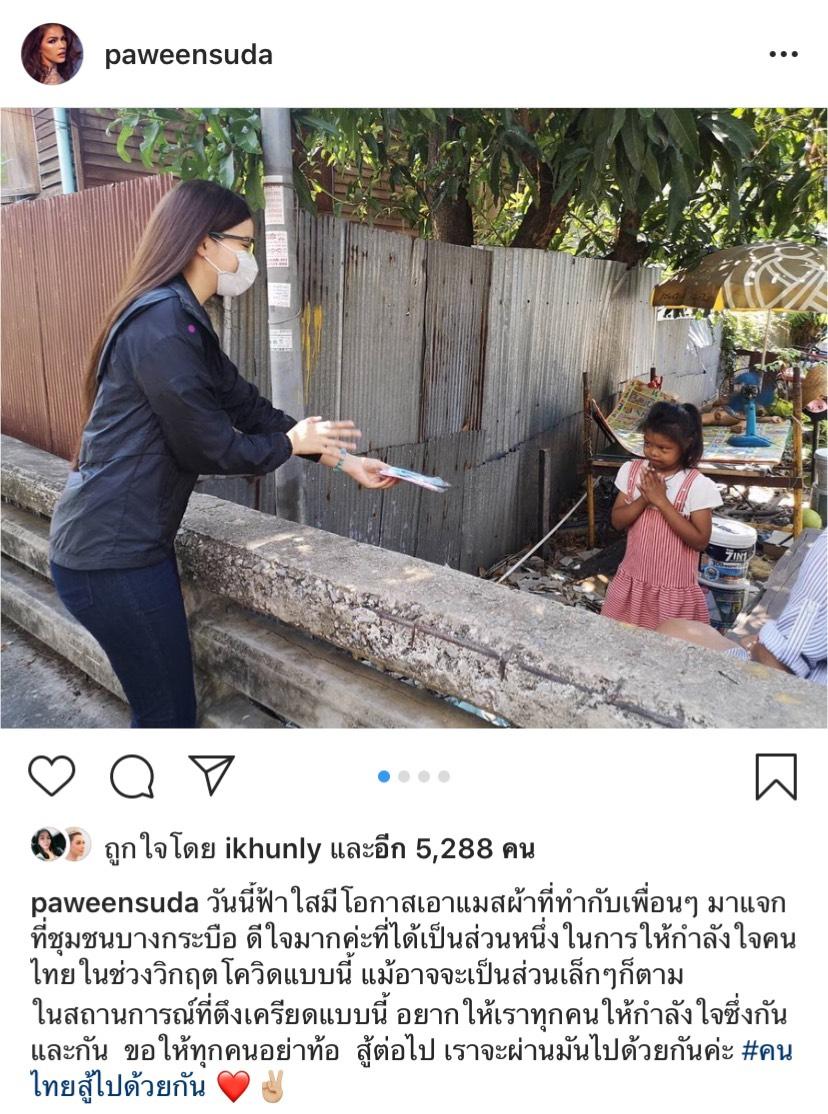 ซึ่งก็มีแฟนๆ นางงามเข้ามาแสดงความคิดเห็นในเรื่องนี้กันอย่างมากมาย แต่ล่าสุดแม้จะมีดราม่า ถูก โจ้ Surface ออกมาแฉหนักขนาดไหน แต่ ฟ้าใส ปวีณสุดา ก็ไม่ได้ออกมาตอบโต้อะไร หนำซ้ำ ยังลอยตัวเหนือดราม่า ออกไปแจกแมสก์ผ้าให้กับประชาชนที่ชุมชนบางกระบือ ซึ่งเจ้าตัวได้โพสต์รูปและข้อความว่า