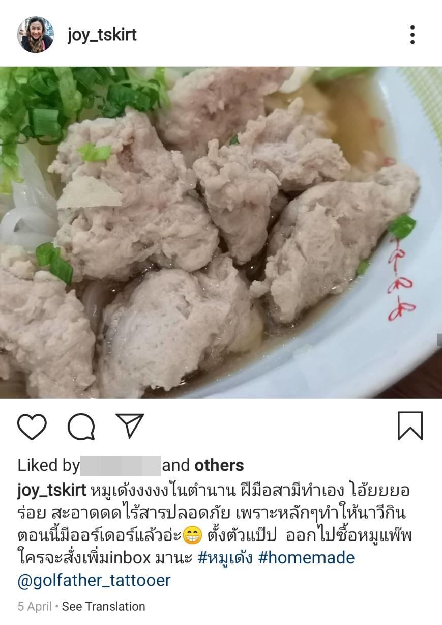 และโพสต์ภาพตัวเองกับหมูเด้งที่เพิ่งทำเสร็จใหม่ๆ พร้อมทั้งเขียนข้อความ “หนู (ให้สามีทำ) ทำหมูเด้ง home made หมูเด้งสดเอาไปแช่ฟรีซ เมนูไหนก็อร่อย